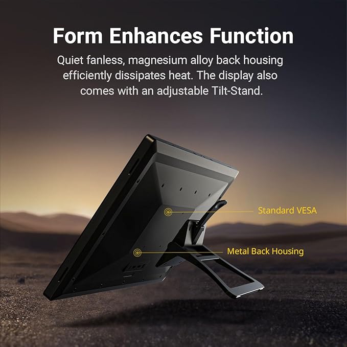 - Ergonomic Modern Design: This new display has a simple but well thought out design that is comfortable for hours of use and can adapt to the creators' preferences. Quiet fan-less performance during your creative time comprised of a magnesium alloy back housing to dissipate heat. Draw easily on the edge-to-edge glass and adjust seamlessly with a one hand with the included Tilt-stand with a one maneuver from 16 to 72 degrees. The Pen Display 24 covers all productivity needs, delivers on comfort with adaptable solutions and workflow.
