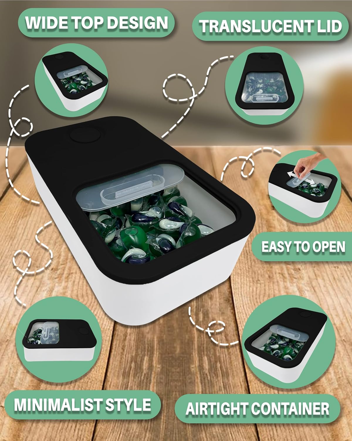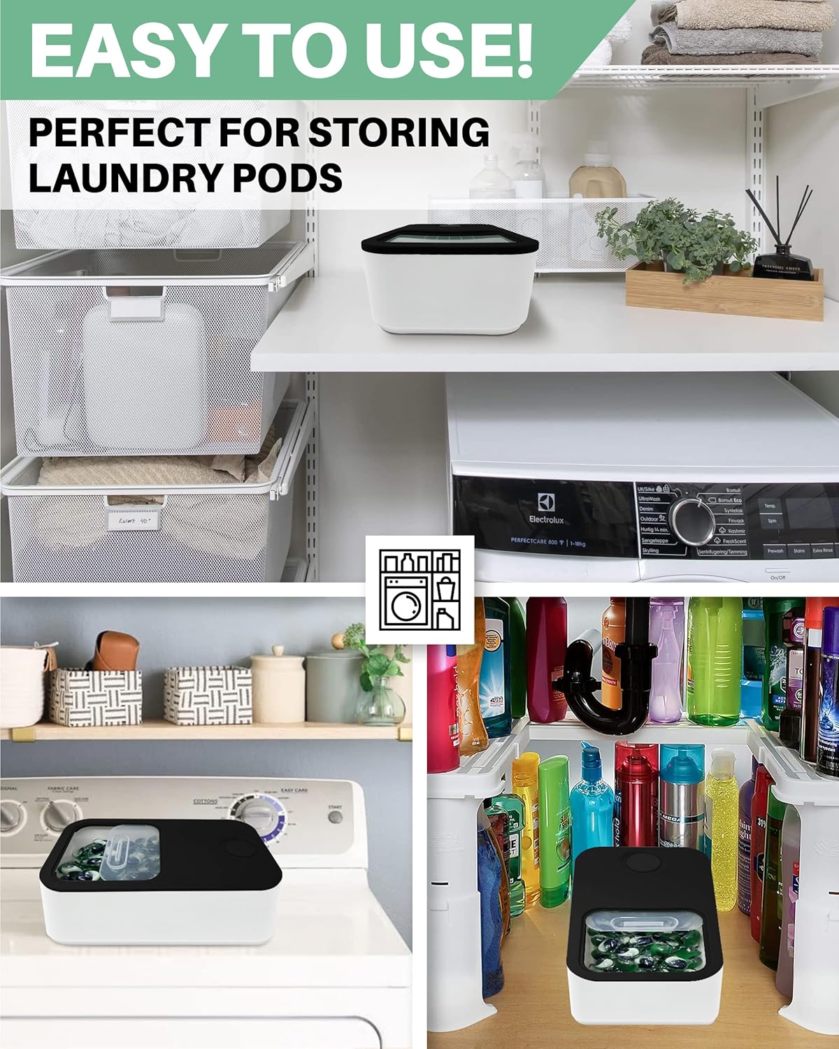 - [LAUNDRY PODS CONTAINER WITH SLIDE LID] - Our Laundry Pods Holder Storage Container with Slide Lid has an elegant design that makes it easy for you to open and fill it in. This laundry pod storage container has a transparent cover lid where you can effortlessly check what’s inside and keep your laundry soap pods fresh and tidy. This laundry detergent holder will also help prevent your laundry pods from drying out too quickly