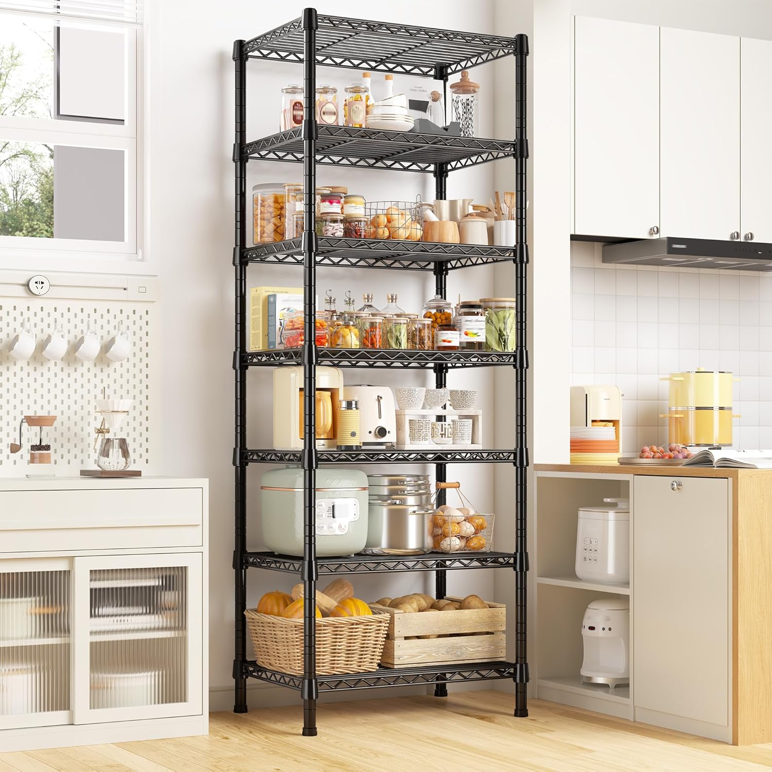 - 【1176 LBS Super Sturdy Metal Shelving 】Back to school supplies! This metal shelves for storage made of heavy duty steel wire,and has undergone special coating treatment.Every solid thickened shelving with extra stiffener,can easily bear 168LBS each shelf ,1176 lbs bearing capacity totally.which means this metal shelving unit will always be your reliable partner