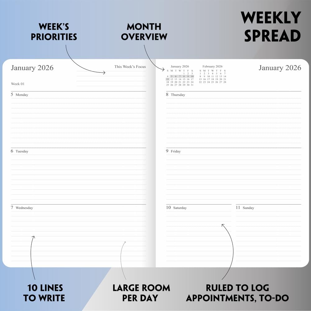 - Dated 2025-2026 planner with monthly and weekly pages for year-round planning, Oct 2025 - Dec 2026