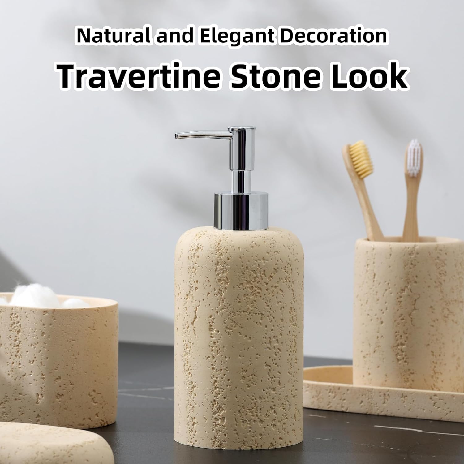 - 5 Piece Bathroom Accessory Set for Your Daily Needs: Includes 1 x soap dispenser ( 250ml / 8oz ), 1 x toothbrush holder, 1 x qtip holder and 1 x mouthwash cup, 1 x tray. Our modern bathroom accessories set keeps the bathroom organized elements that complement your bathroom perfectly, adding a fashion feel to your bathroom. This bathroom accessory set essential is ideal for your bathroom and many more.