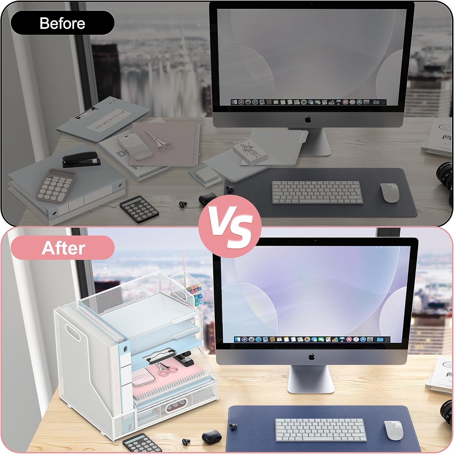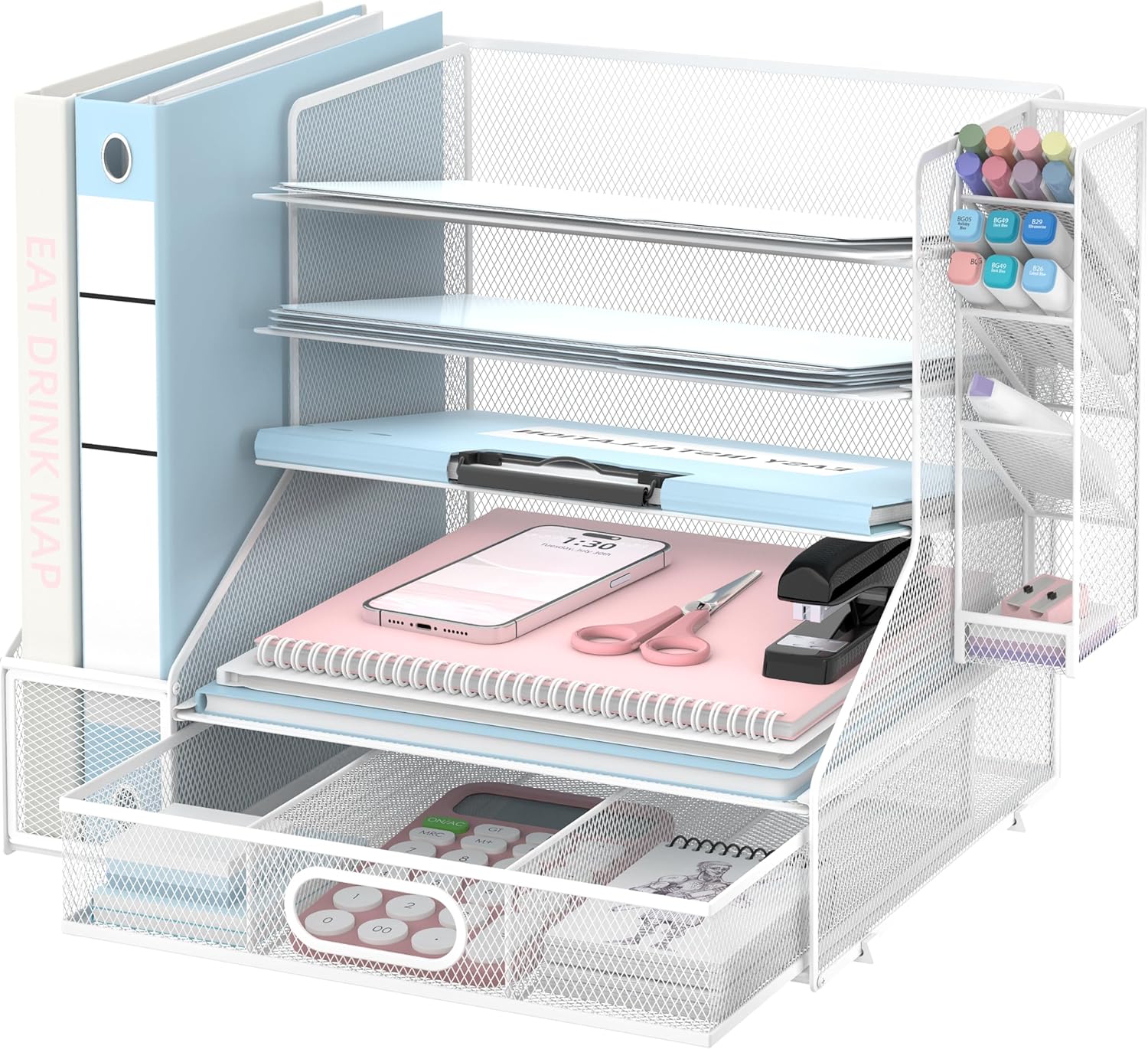 - [Save Space and Time] Large-capacuty vertical file holder can hold more of your file folders and books. The paper tray organizer is very suitable for storing books, magazines, letters, and A4 paper. The hanging pen holder is very convenient for you to put pencils and pens, and the large capacity drawer can hold all other office supply accessories, such as sticky notes, scissors, staplers, and so on.