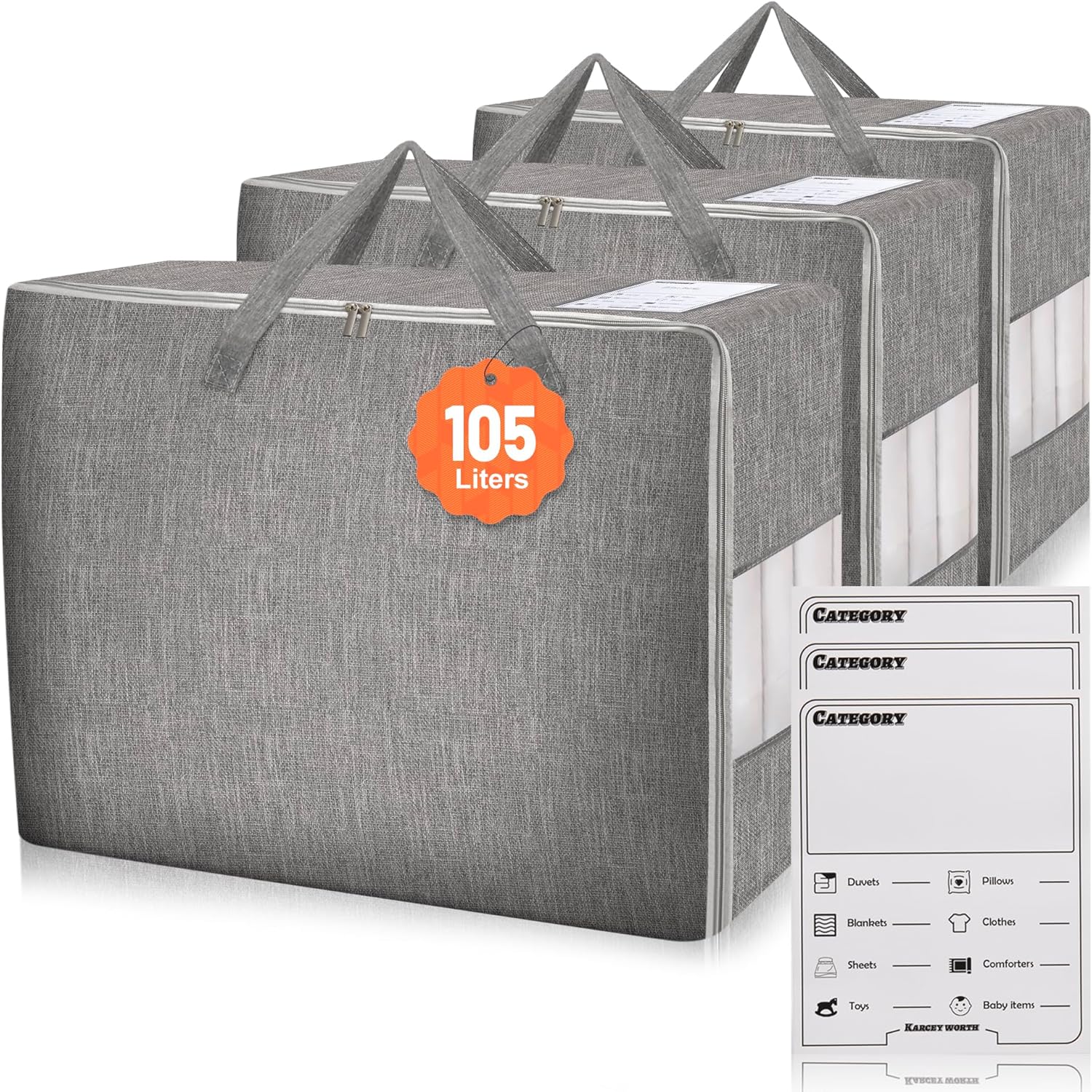 - 【Clear Window & Category Card】The bedding storage bags for comforters and blankets has a clear window which allows quick viewing. Specially, each storage bag comes with one category card, categories include: comforters/duvets/pillows/blankets/clothes/sheets/toys/baby items, or you can fill in the category in the blank of top card