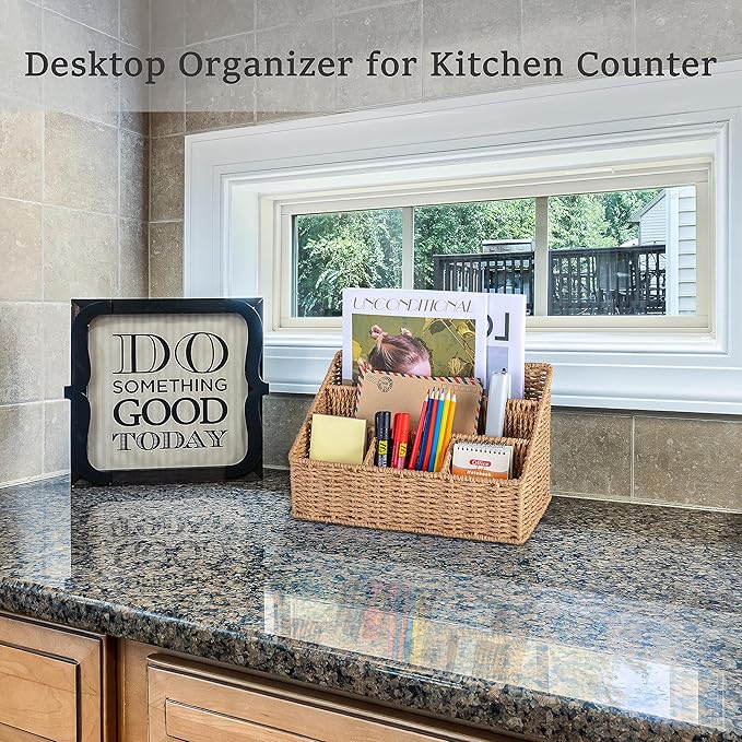 - Upgraded mail and bill organizer countertop:The new desktop organizer has five compartments, the two largest sections are perfect for things that need to be filed, and with the small sections easily at hand you can always reach for pens,stationary,sticky pads,small keys,ect.