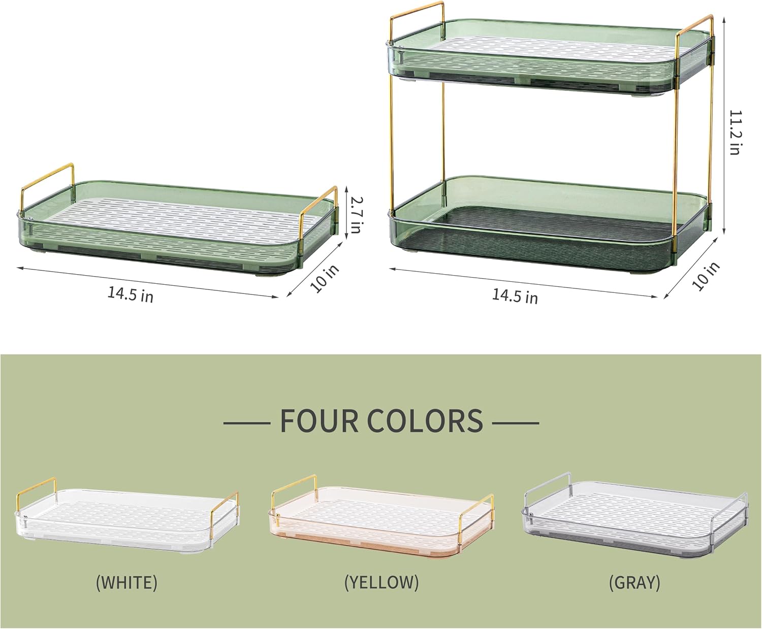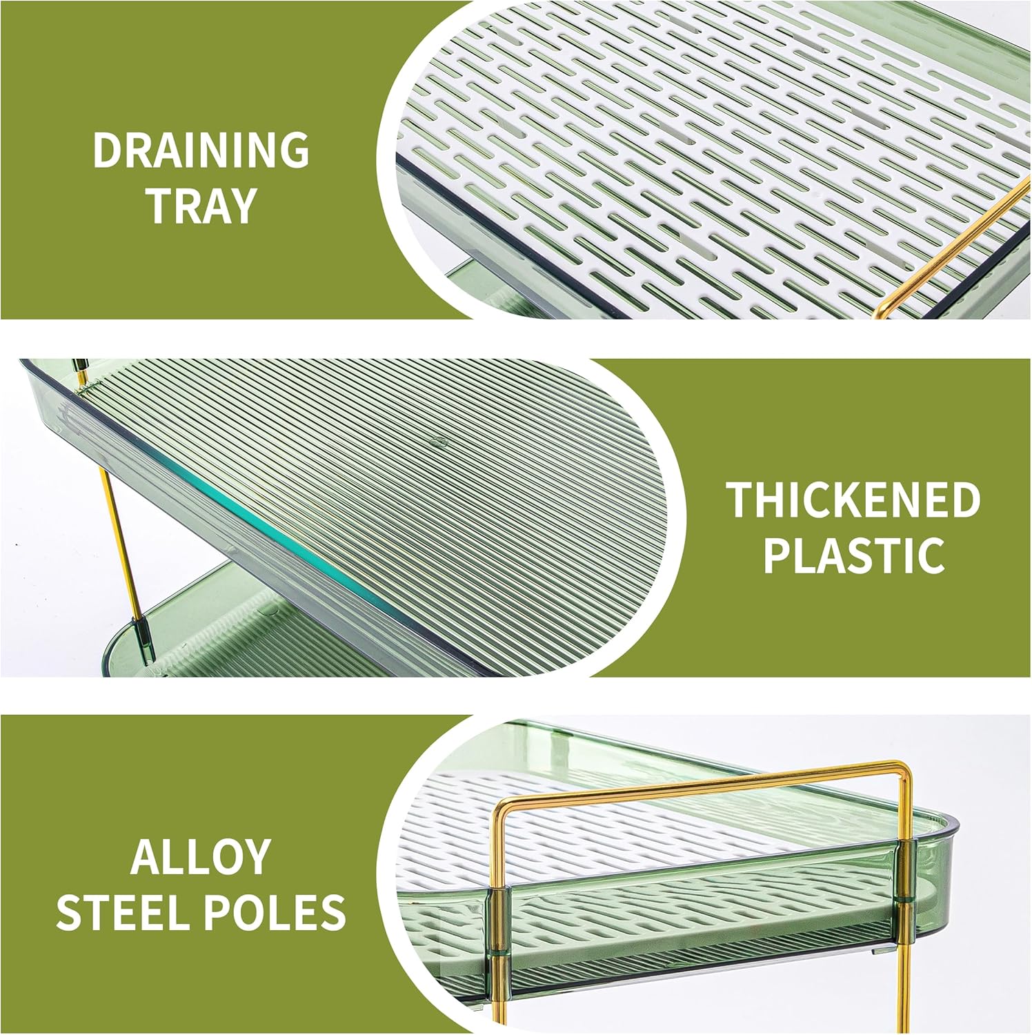 - 【Double usages】The draining board of the storage shelf is removable, which can be used as a normal organizer to store cosmetics, skincare, perfume, and spice on the vanity, bathroom and kitchen countertop, or added the draining board to drain glasses, fruit, toiletries, etc