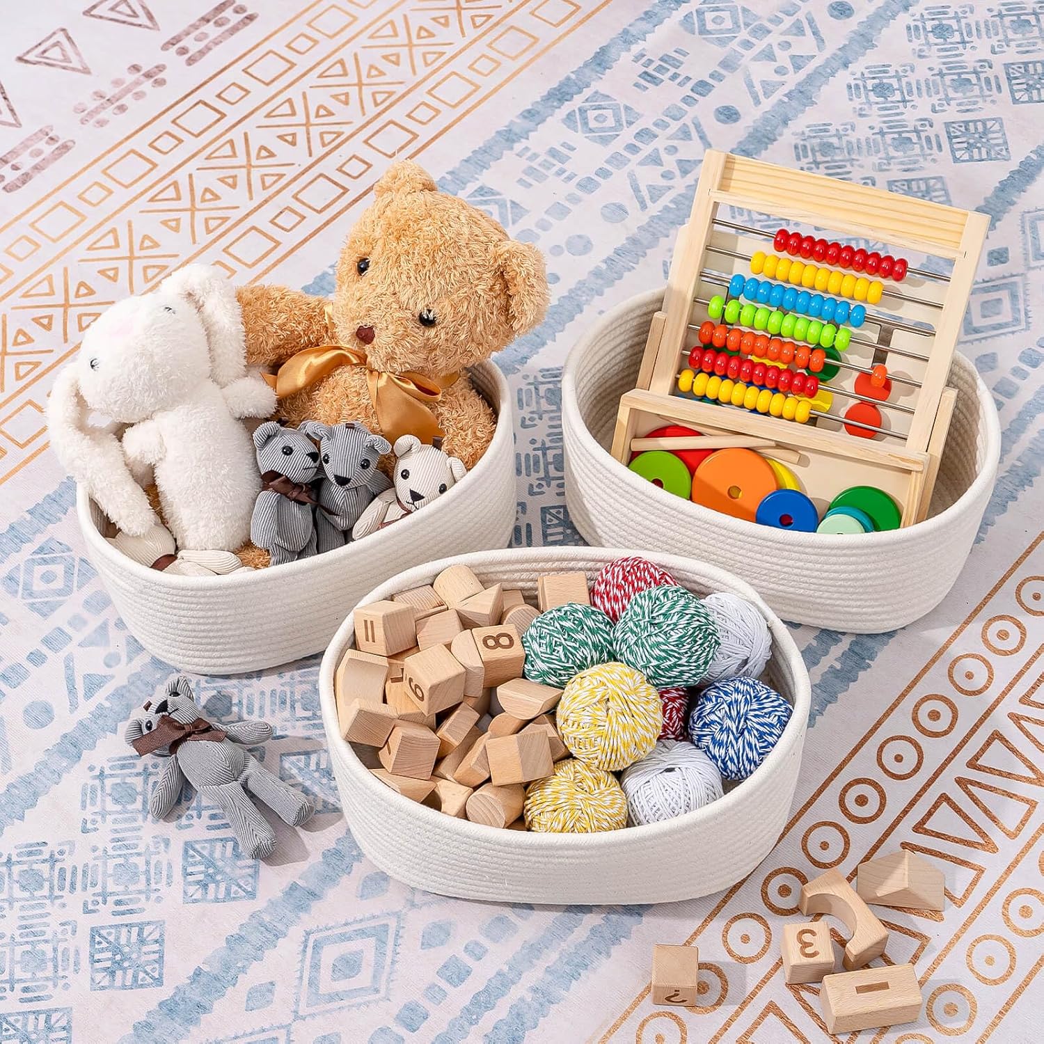 - Classy Natural Cotton Rope Storage Baskets-High quality well made. Very sturdy and a cute modern style. Durable woven rope, Long-lasting, skin-friendly, soft and attractive. You need these adorable baskets to put some supplies in, diaper, jewelry, cosmetics, makeup brushes, tea bags, storing smaller toys, toddler socks, candy