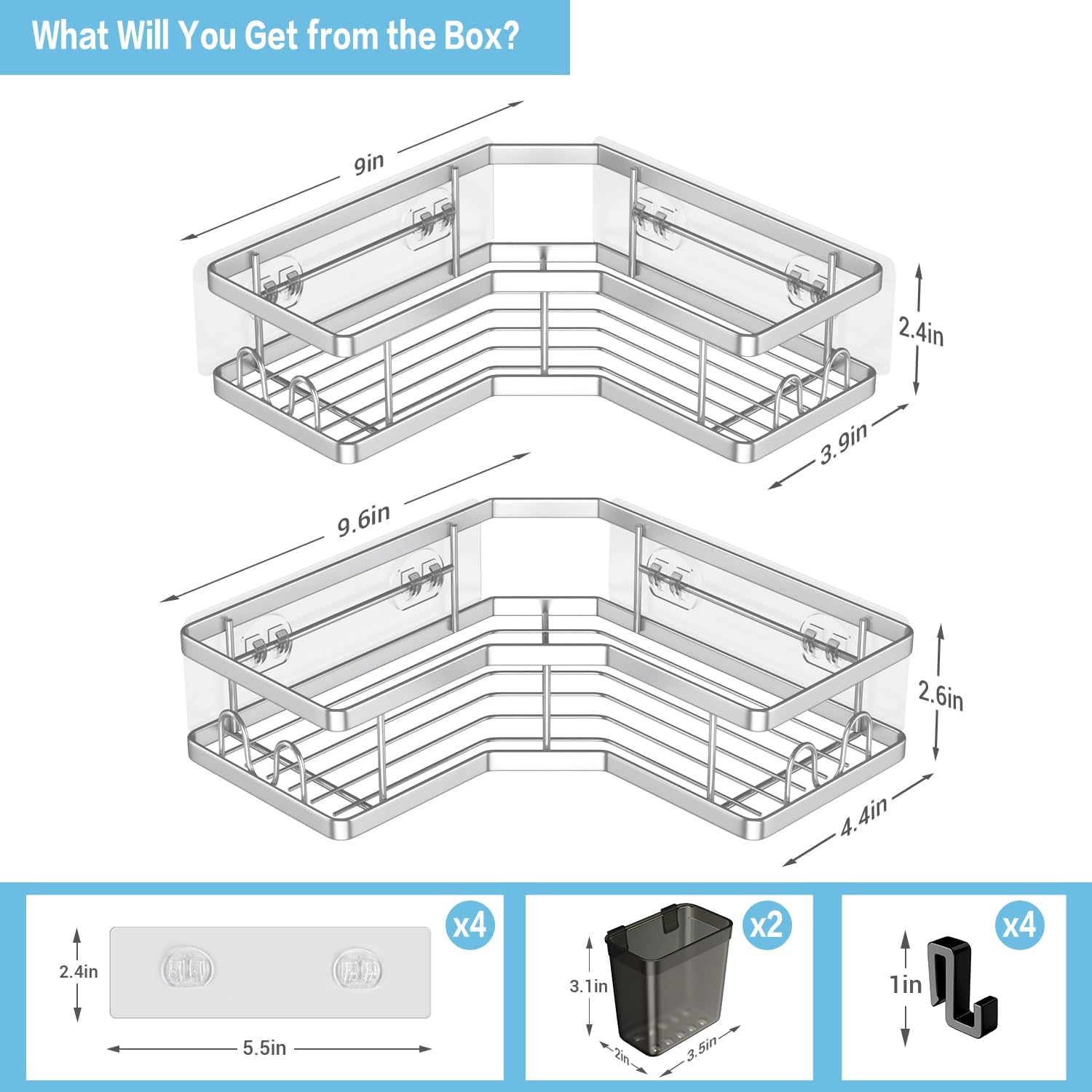 - [Premium Material & Package Contents]: Corner shower organizer is made of stainless steel, coated with rustproof paint and the solid frame wire is much more thickened than old version shower caddies. Package included: 2 x corner shower caddy, 4 x adhesive, 4 x plastic hook, 2 x toothpaste holder.