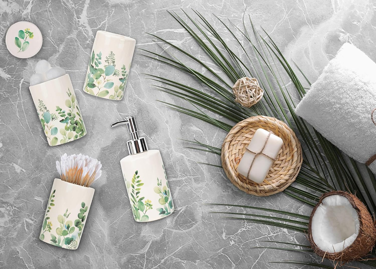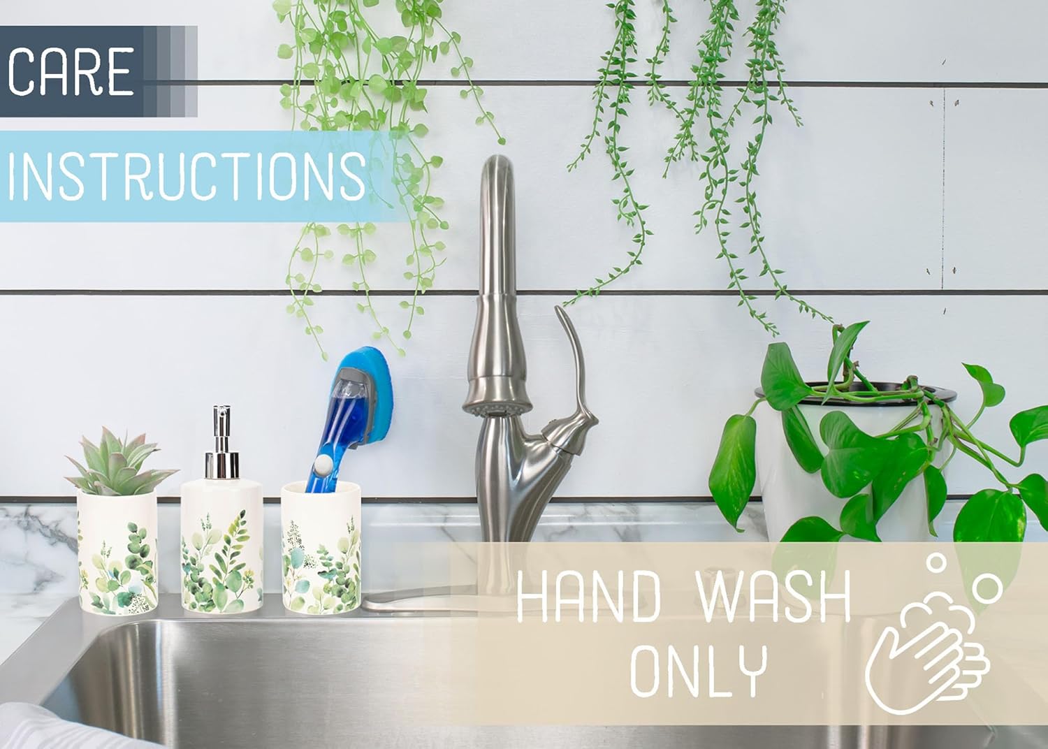 - DURABLE CERAMIC STONEWARE: With an eucalyptus greenery on cream white finish; Hand soap dispenser features a silver tone accent pump; Essential to keep your sink countertop organized; Handwash only.