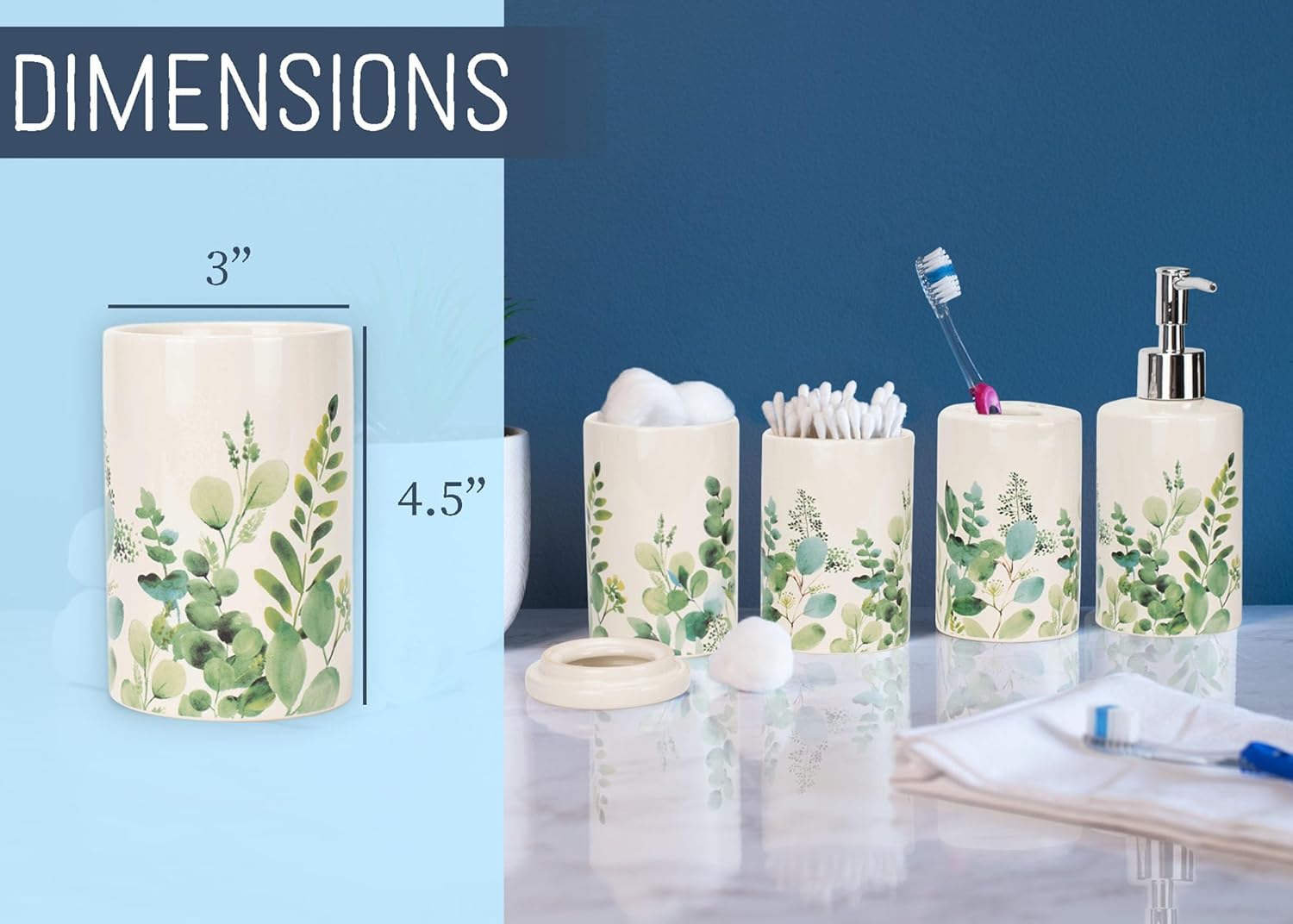 NAT & Jules Chic Modern Rounded 4.5 inch Ceramic Bathroom Accessories Set of 4 - Home Décor & Organization Perfect for Bath or Kitchen Household Essentials, Floral Greenery on Cream White