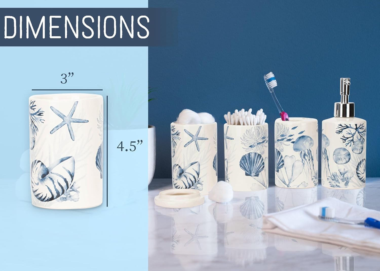 NAT & Jules Chic Modern Rounded 4.5 inch Ceramic Bathroom Accessories Set of 4 - Home Décor & Organization Perfect for Bath or Kitchen Household Essentials, Beach Nautical Blue & White