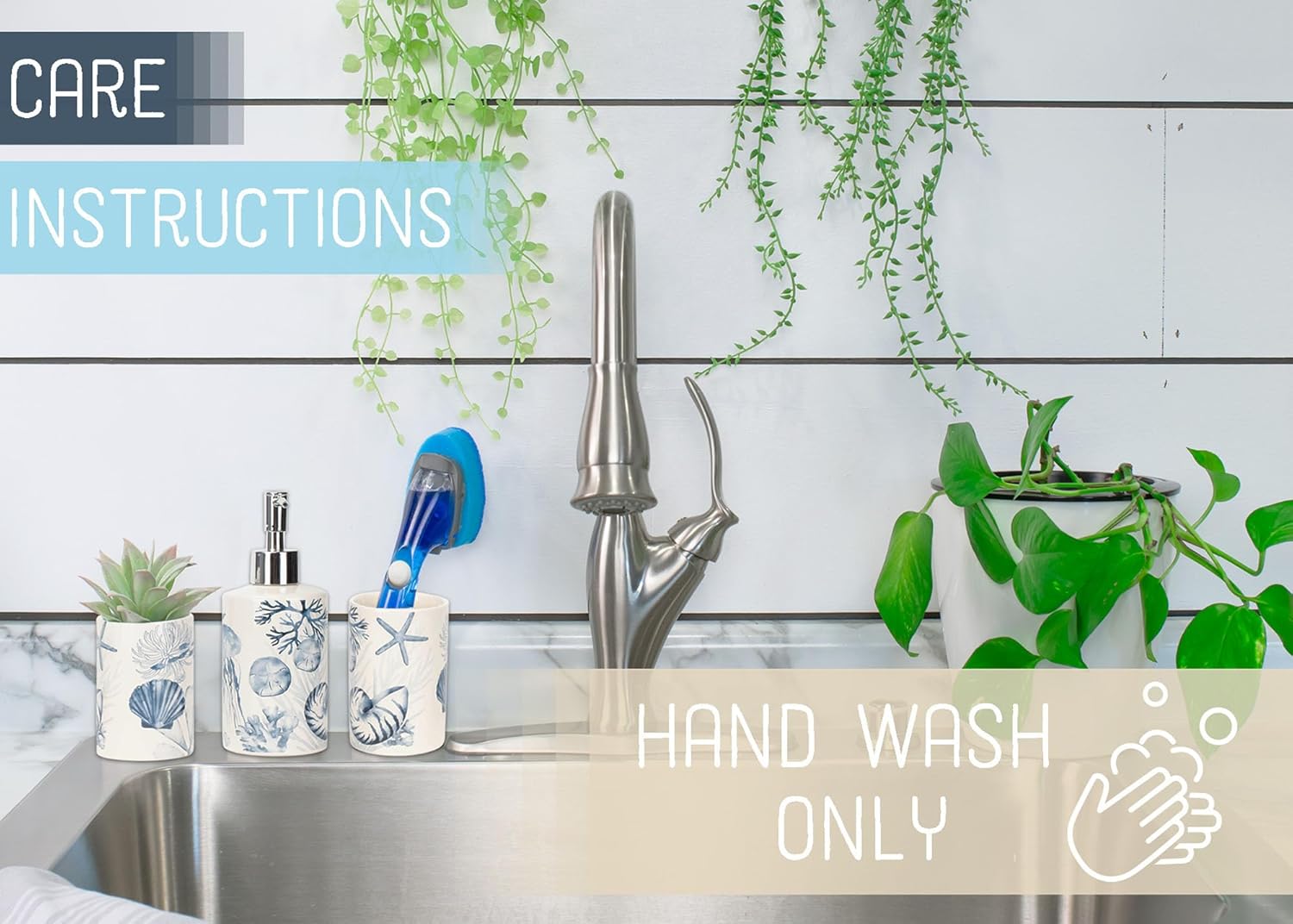- DURABLE CERAMIC STONEWARE: With a fun and beach themed decal on cream finish; Hand soap dispenser features a silver tone accent pump; Essential to keep your sink countertop organized; Handwash only.