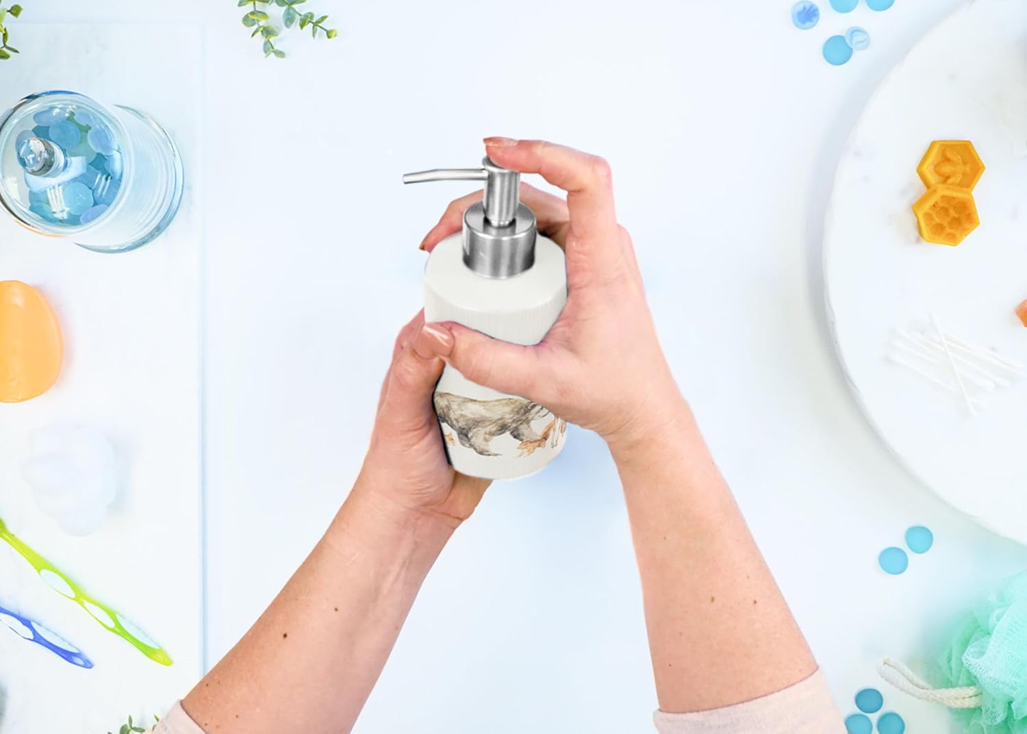 - DURABLE CERAMIC STONEWARE: With a lodge & cabin themed decal on cream finish; Hand soap dispenser features a silver tone accent pump; Essential to keep your sink countertop organized; Handwash only.