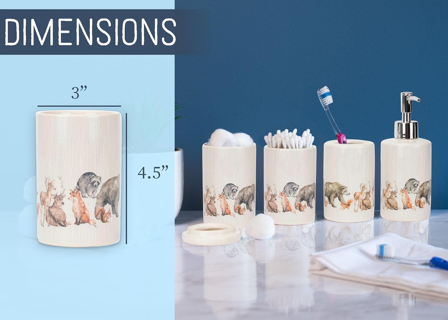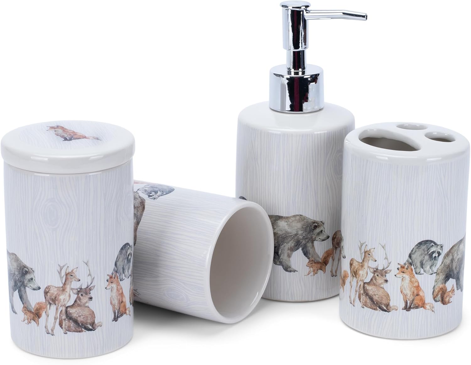 NAT & Jules Chic Modern Rounded 4.5 inch Ceramic Bathroom Accessories Set of 4 - Home Décor & Organization Perfect for Bath or Kitchen Household Essentials, Lodge Animals
