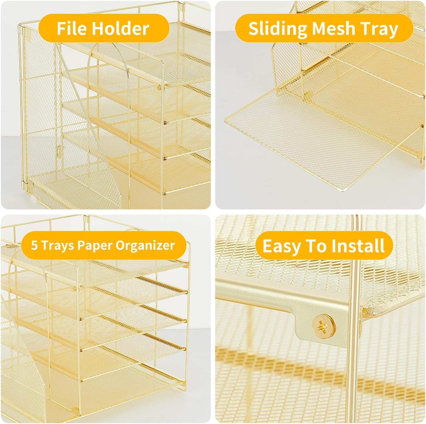 Desk Organizers and Accessories, 5-Tier Paper Letter Tray Organizer with File Holder, Desktop Organizer for Office Supplies (Gold)