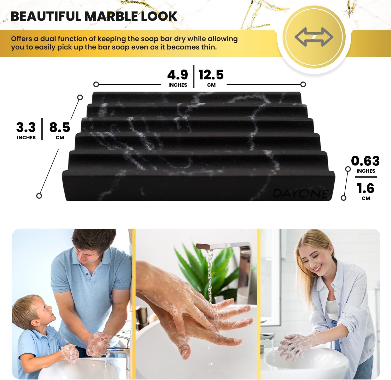 DAYONE Holder with Marble Look - Soap Dish with Soap Saver Ridges Rectangle Bar Soap Holder with Non Slip Feet - Soap Tray for Bathroom, Sink, Kitchen, and SPA (Black)