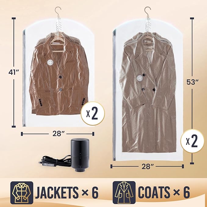 - Come with Electric Pump: Size of Vacuum Storage Bags: 2 Long( 53x28 in)+ 2 Short( 41x28 in). No need to hesitate to purchase due to lacking tools. Just a simple process of packing, sealing, and vacuuming accomplishes clothing organization, making it even simpler. With a portable electric air pump, our hanging vacuum storage bags protect your clothes whether you're on a business trip or traveling