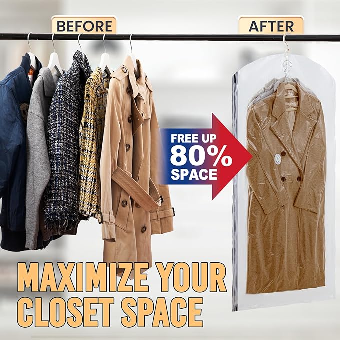 - Protect Clothes Better: By utilizing vertical storage, hanging vacuum storage bags can minimize clothes wrinkles and prevent clothes from being deformed, Made of 5 layers of PA+PE material, Vacuum storage bags are waterproof and dustproof, keep your clothes in a clean and independent space all year round