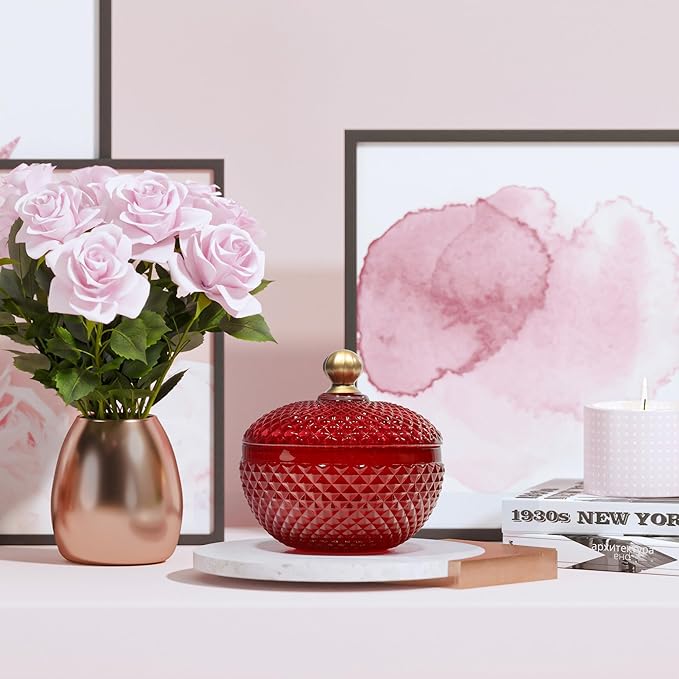 Joeyan 12 oz Small Red Glass Jewelry Box Jars with Lid,Embossed Glass Candy Dishes,Diamond Faceted Food Container,Decorative Apothecary Canisters,Colored Kitchen Bathroom Buffet Storage Organizer