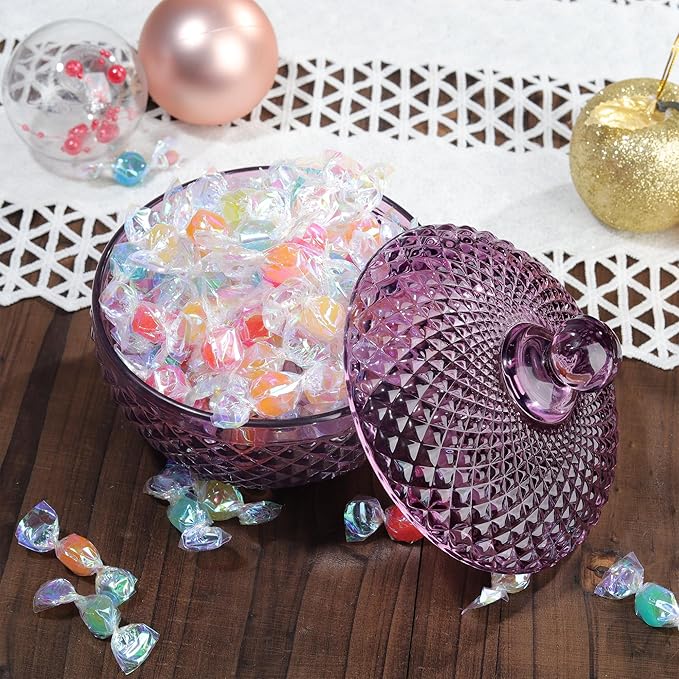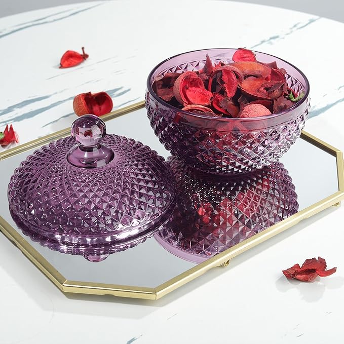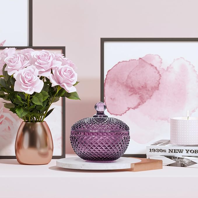 Joeyan 12 oz Small Dark Purple Glass Jars with Lid,Embossed Candy Dishes,Diamond Faceted Food Container,Decorative Jewelry Box Apothecary Canisters,Colored Kitchen Bathroom Buffet Storage Organizer