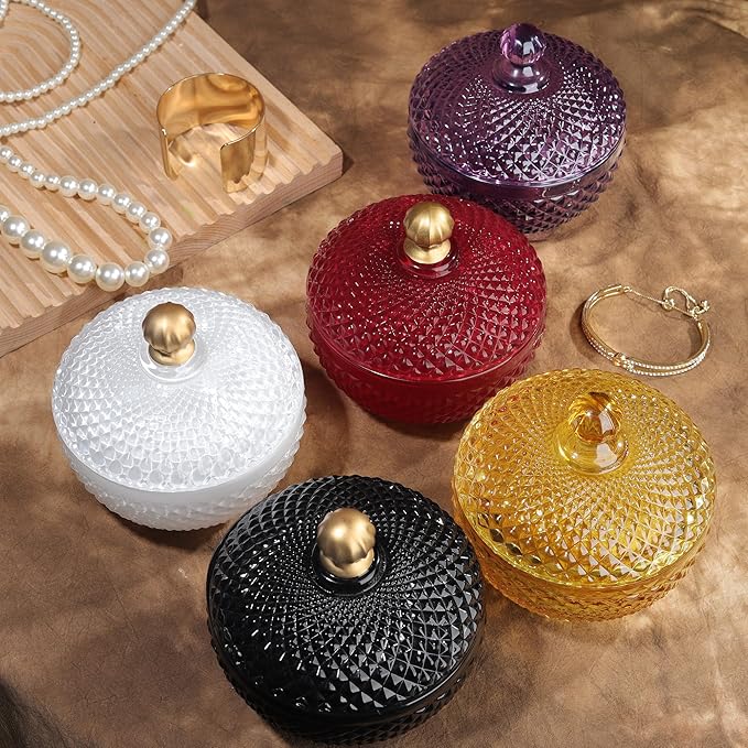 - Proper Size: Colored decorative jar has a right size, with size in approx. 4.72 x 2.36 x 4.76 inches/12 x 6 x 12.1 cm, and they will not take up too much space. This storage container can be used for bathroom storage, as a jewelry box, or for your favorite keepsakes, trinkets and wedding candy buffet. It’s perfect to store nuts, cookies, candy, cotton swabs, soap, aromatherapy, bath salts, trinkets, jewelry, lipstick, etc.