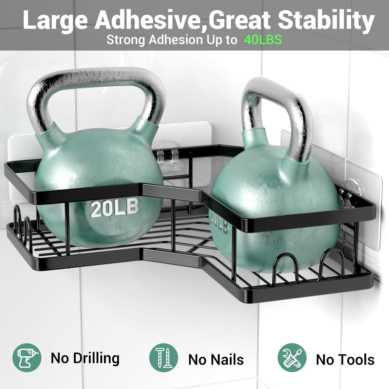 - [Sturdy & Strong Adhesive Hooks]: The adhesive strips are super sticky on flat surfaces and hold up to 40 lbs. Shower shelves is extremely strong and durable to hold big bottles, such as gallon size shampoo and conditioner, body wash and other shower bottles. Please note: Shower rack fits 90 degrees wall corner only, not suitable for rounded or curved corner space.