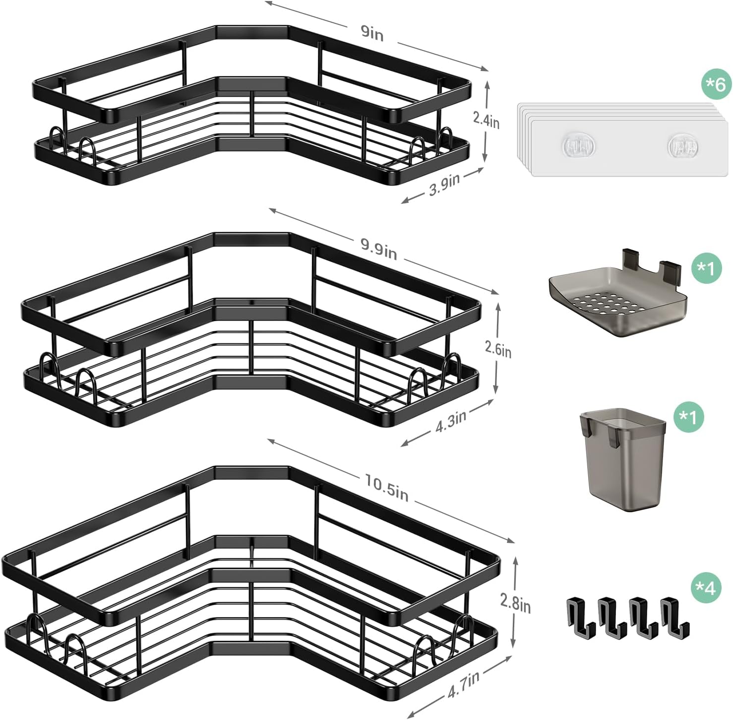 - [Premium Black Shower Caddy]: Corner shower organizer is made of premium stainless steel, coated with rustproof paint and the solid frame wire is much more thickened than old version shower caddies. Bonus little hooks are very convenient for hanging a wash towel. Soap holder and toothpaste holder help to organize your shower supplies.