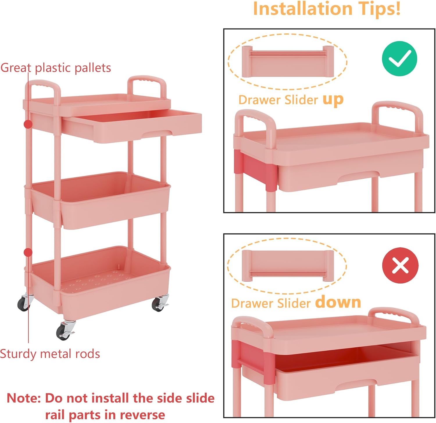 Calmootey 3-Tier Rolling Utility Cart with Drawer,Multifunctional Storage Organizer with Plastic Shelf & Metal Wheel,Storage Cart for Kitchen,Bathroom,Living Room,Office,Pink