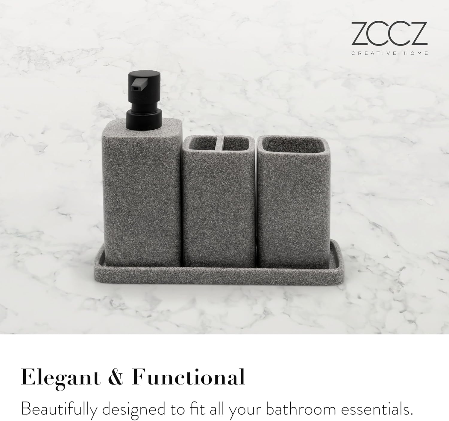 ZCCZ Grey Bathroom Accessory Sets, 4 Pieces Bathroom Accessories Complete Set Vanity Countertop Accessory Set, Includes Lotion Dispenser Soap Pump, Tumbler, Toothbrush Holder and Tray