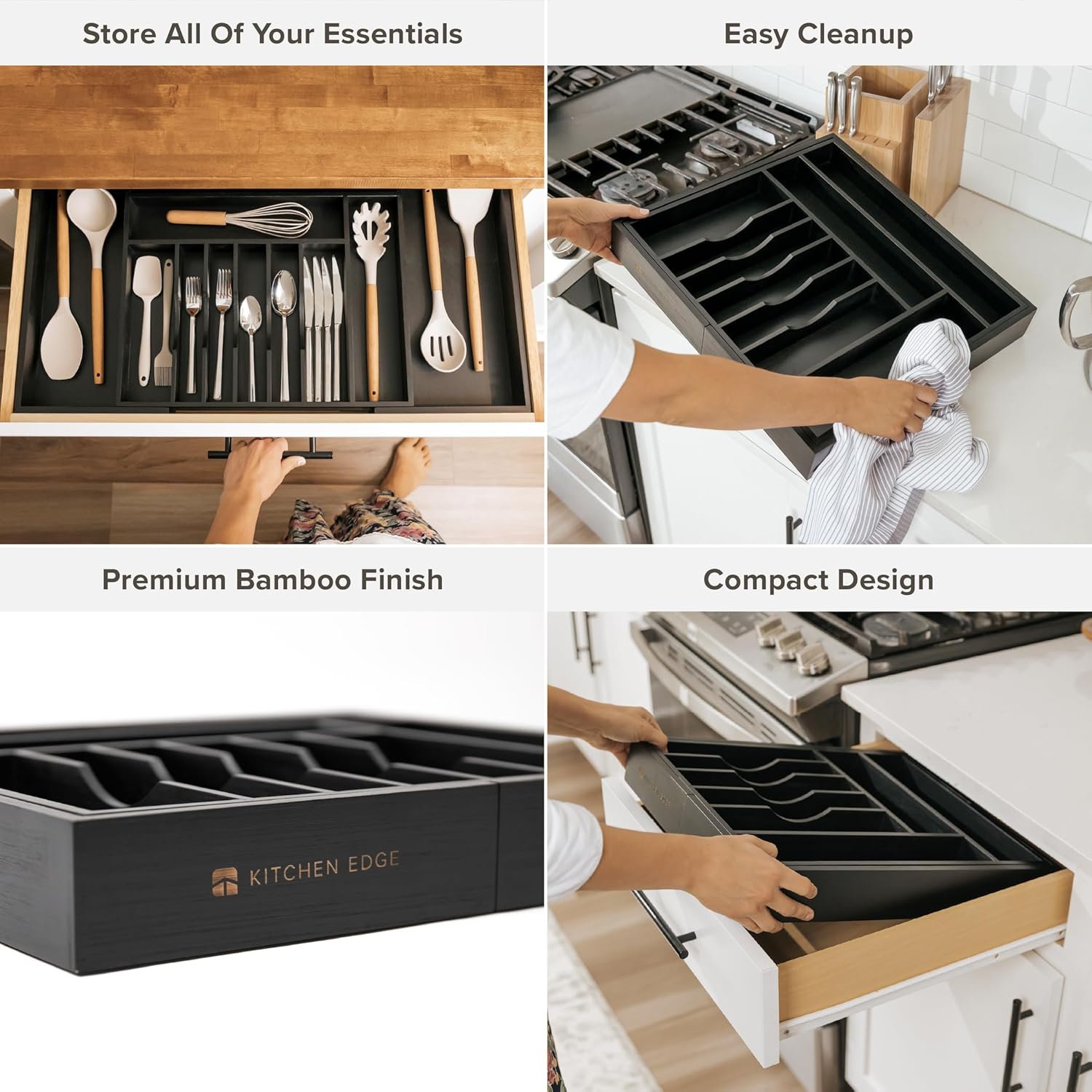KitchenEdge Premium Silverware, Flatware and Utensil Organizer for Kitchen Drawers, Food-Safe Contract Grade, Expandable from 18 to 33 In, Black Bamboo