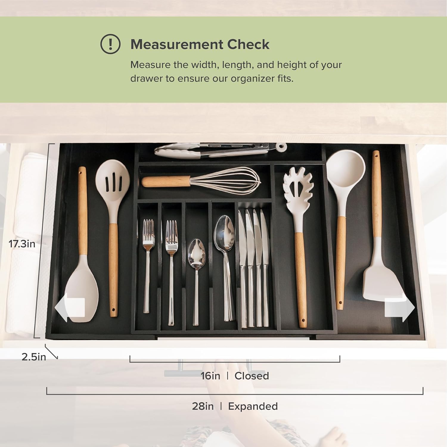 - ADDED HEIGHT, ADDED STORAGE - With an 10-compartment layout (8 fixed + 2 adjustable), this organizer measures 17.4” in length, 2.7” in height, and can stretch between 16” to 28” in width. While many organizers cap at 22” or 23” width and a 2" height, ours provides extra storage courtesy of an additional 0.7" in height, optimizing space when packed with utensils.