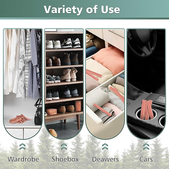 - Great Quantity: 50 cedar pieces are enough to be placed all over the home, such as closet, drawers, pockets, shoes, purses, vehicles, etc
