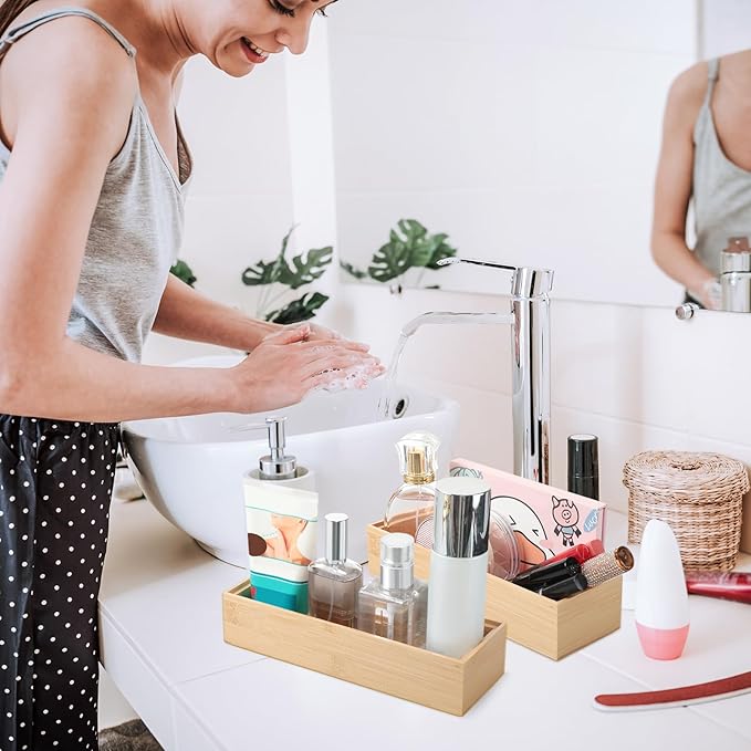 - Comprehensive Package: the package comes with 8 bamboo storage box, providing more storage options for different drawer sizes and items; Whether you need to declutter a large kitchen drawer, small bathroom drawer, or a medium sized desk drawer, these bamboo organizers have got you covered; Enjoy seamless organization and upscale your drawer aesthetic with these versatile and chic organizers