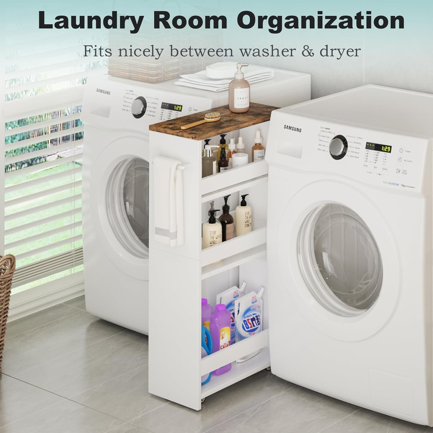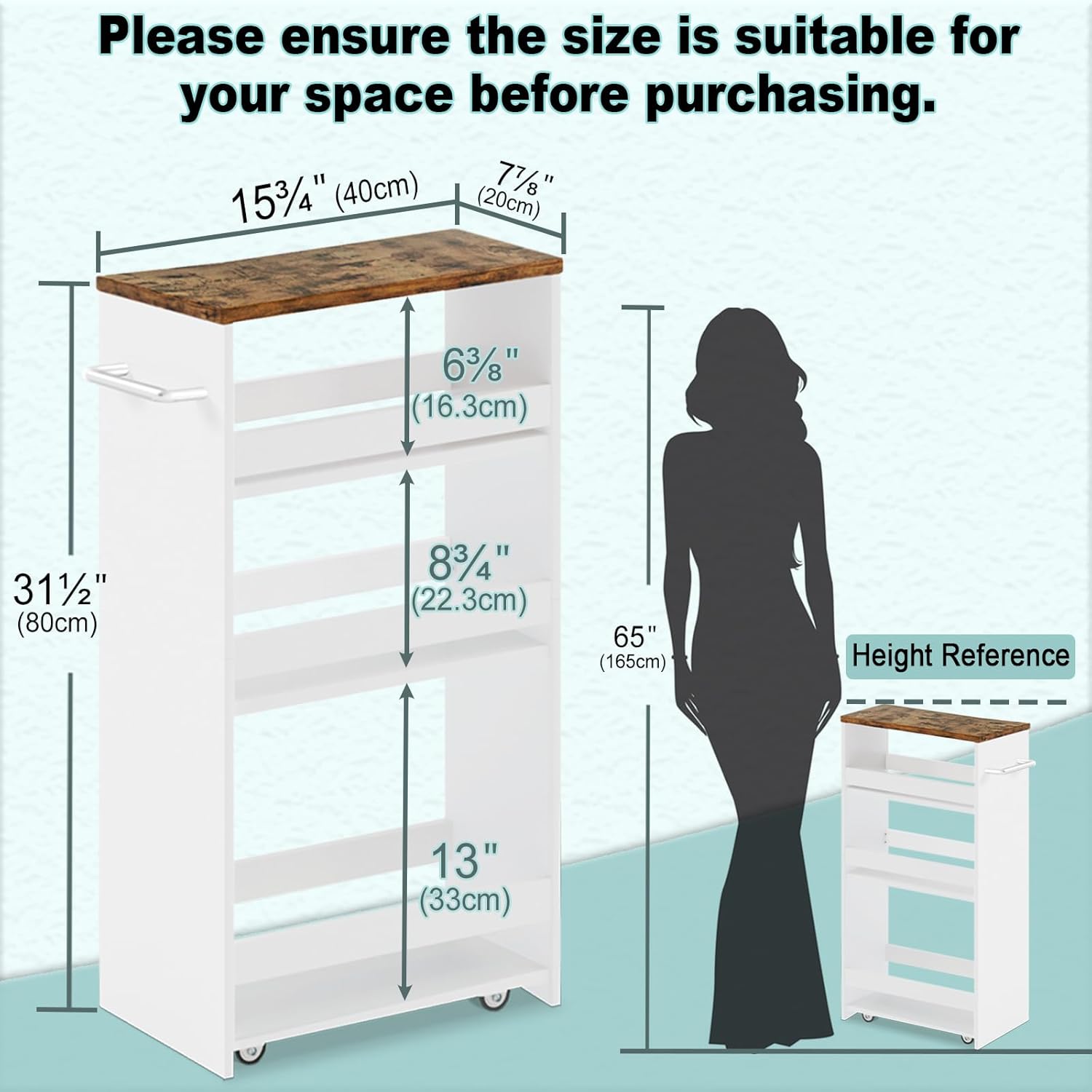 - 【Slim Design for Small Spaces】The size of slim storage cart is 7.9"D x 15.75"W x 31.5"H. It can provide versatile storage in compact space, kitchen next to fridge or closets, laundry rooms between washer and dryer, living room, bathrooms.
