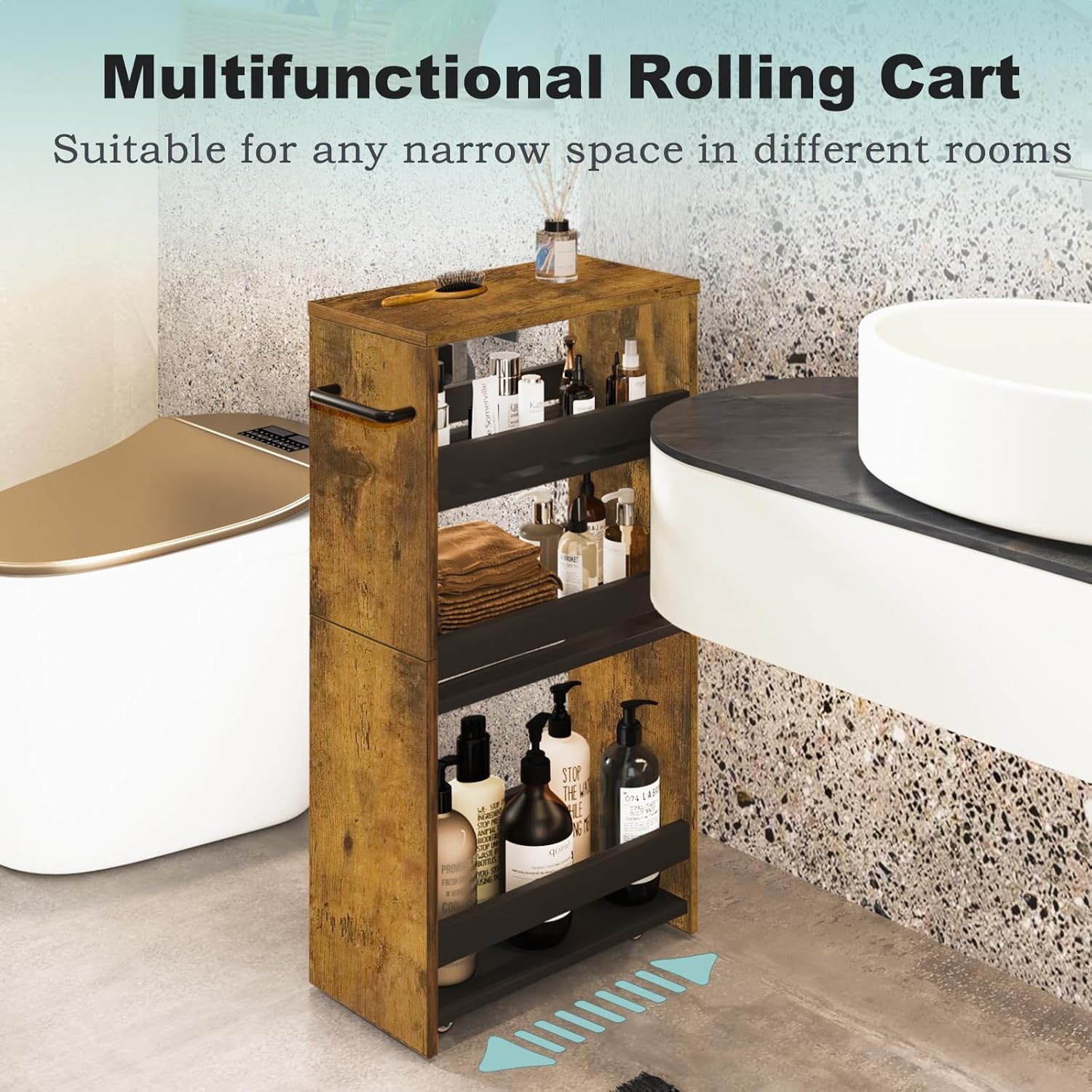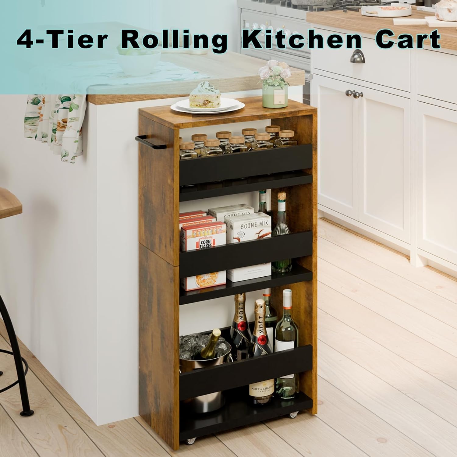 MARTY Rolling Storage Cart 7.9" W, 4-Tier Narrow Kitchen Cart with Wheels Handle, Slim Storage Mobile Shelving Utility Carts for Bathroom Laundry Room Organization Small Spaces(Rustic Brown)