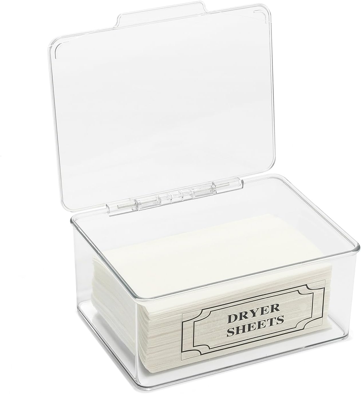 - The clear design allows you to monitor dryer sheet levels and refill in time. With a large capacity of up to 200 dryer sheets, it keeps your laundry room well-stocked and clutter-free. Each container measures: 7.5”W x 5.5”D x 3.5”H