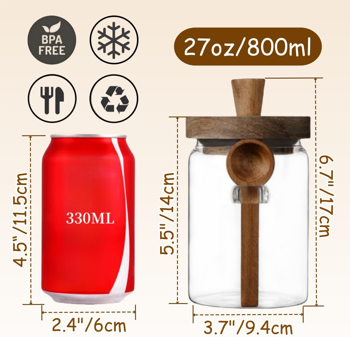 - Portable Size: Measuring 3.7''W x 5.5''H (Lid not included), our glass jar with lid boasts a convenient compact size for easy transportation. The lid with a wooden handle makes the jar easier to open, and the included wooden spoon makes it easy to scoop things out at any time