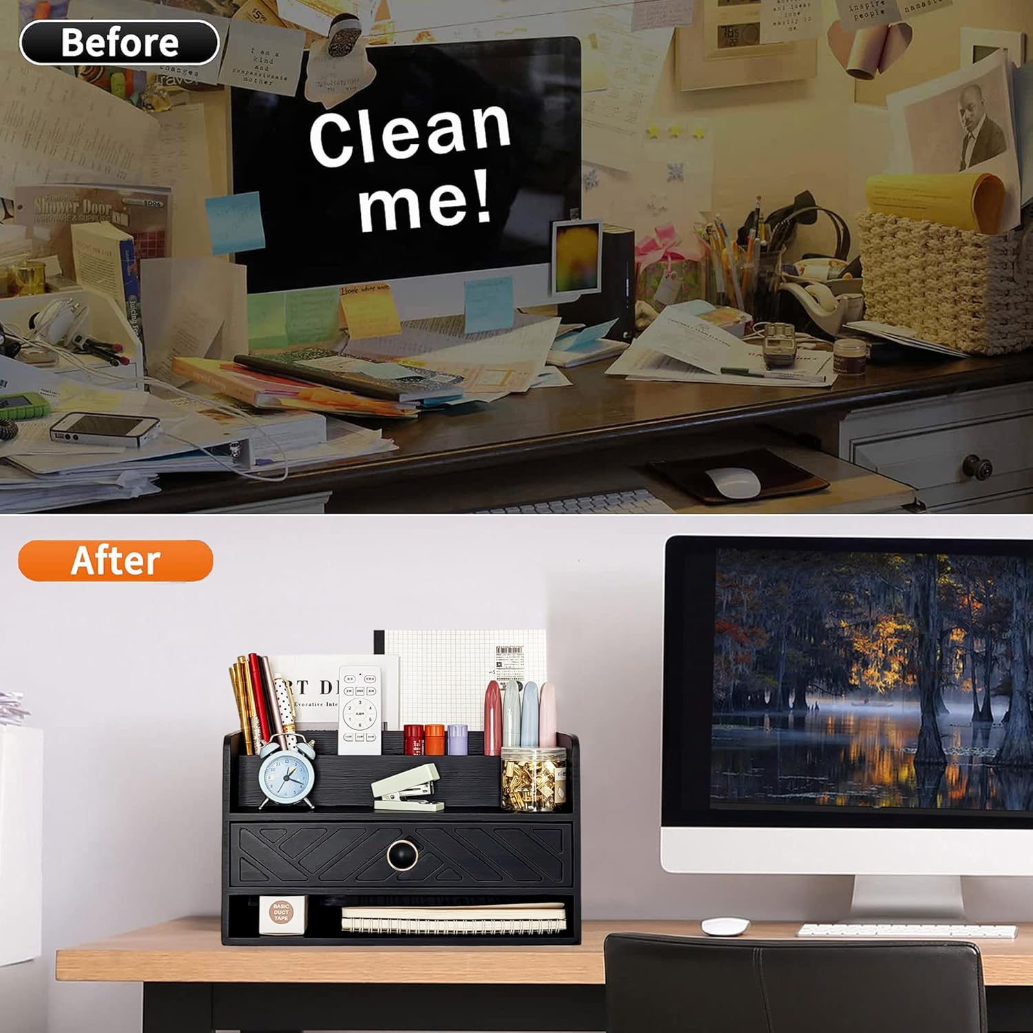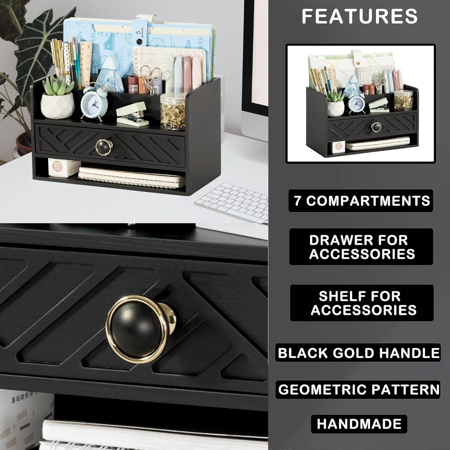Black Wood Desk Organizer and Accessories with Drawer, Bill Mail Organizer and File Mail Holder for Office Supplies, Desk Accessories & Workspace Organizers for Desk Organization