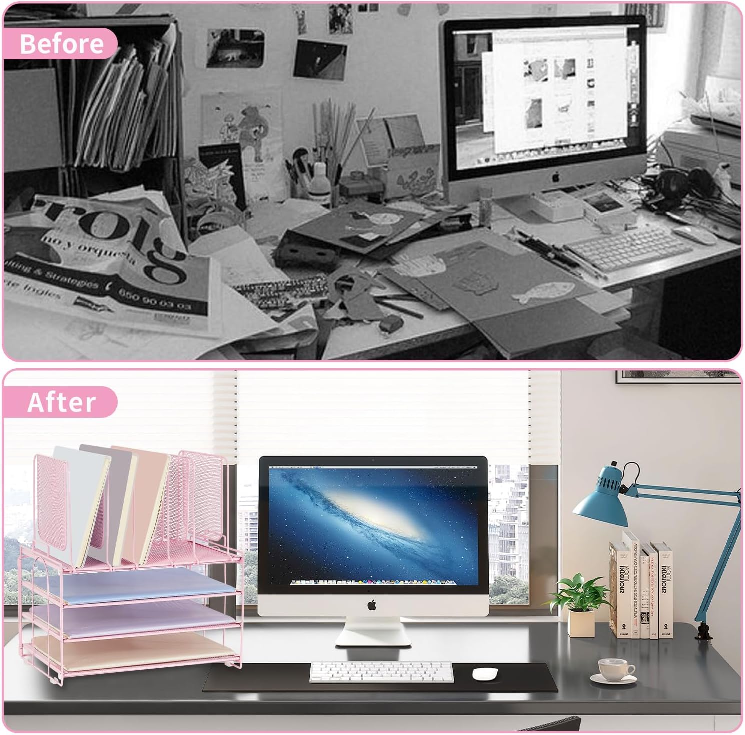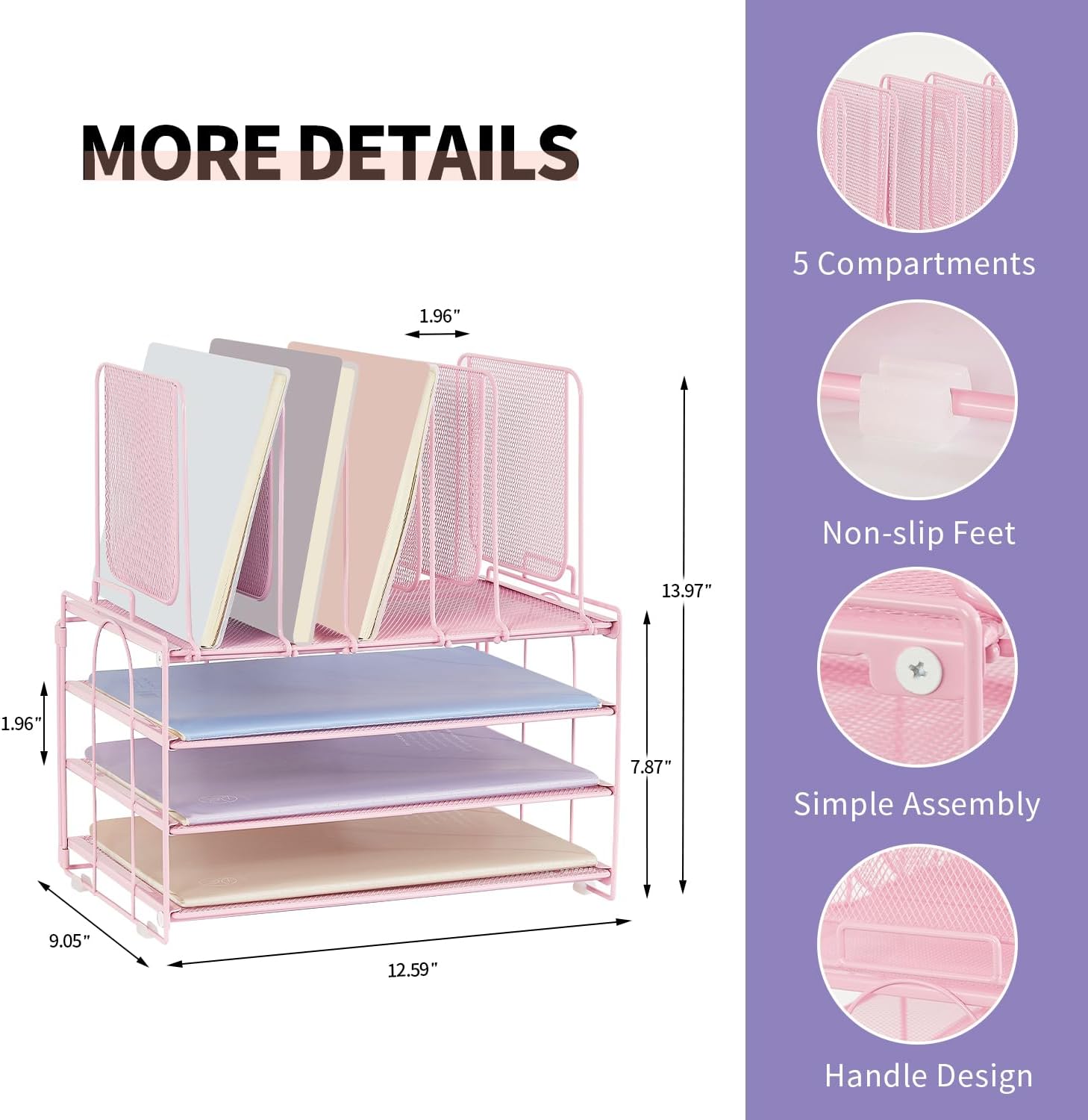 Desk Organizers and Accessories, 3-Tier Paper Organizer with 5 Vertical File Holders, File Organizer for Desk (Pink, 3T)