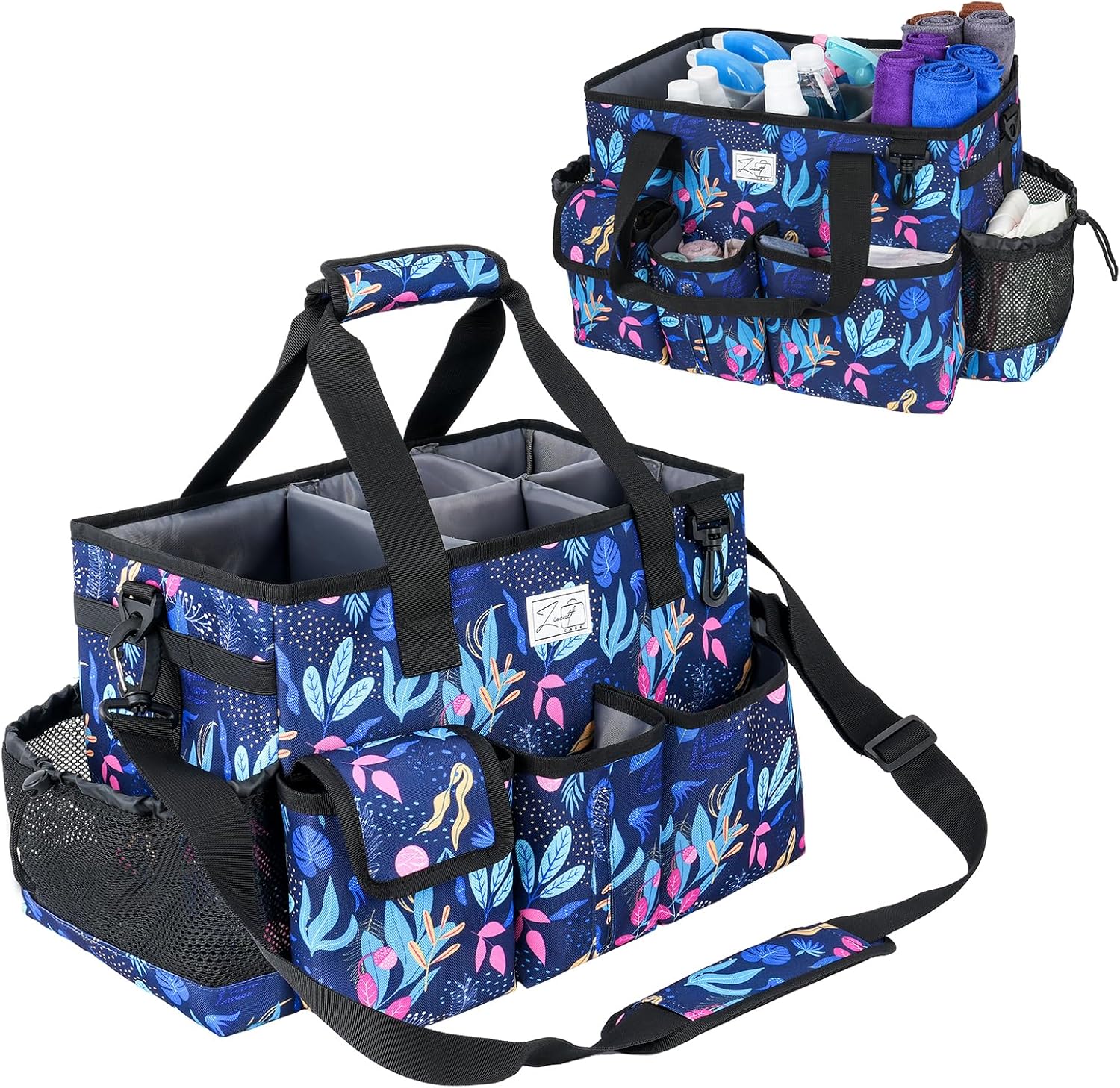 Cleaning Organizer, Large Caddy Bag for Supplies, Housekeeper's Bag with Handle (Blue Leaf)