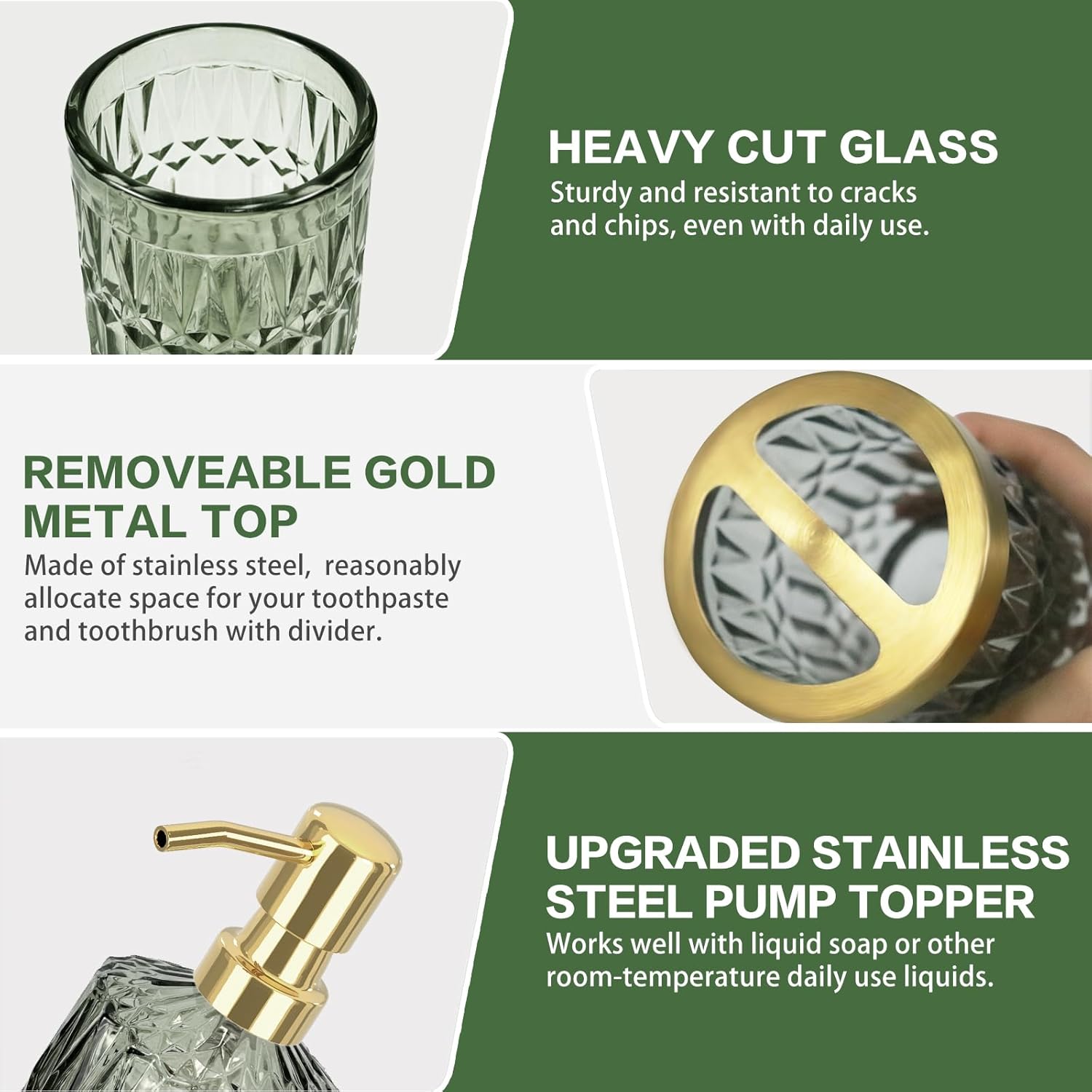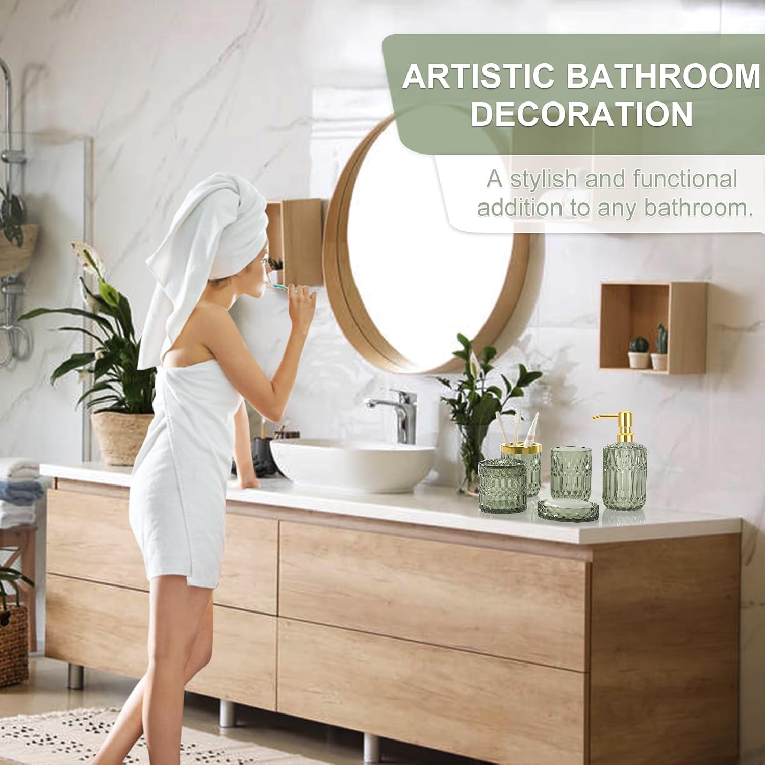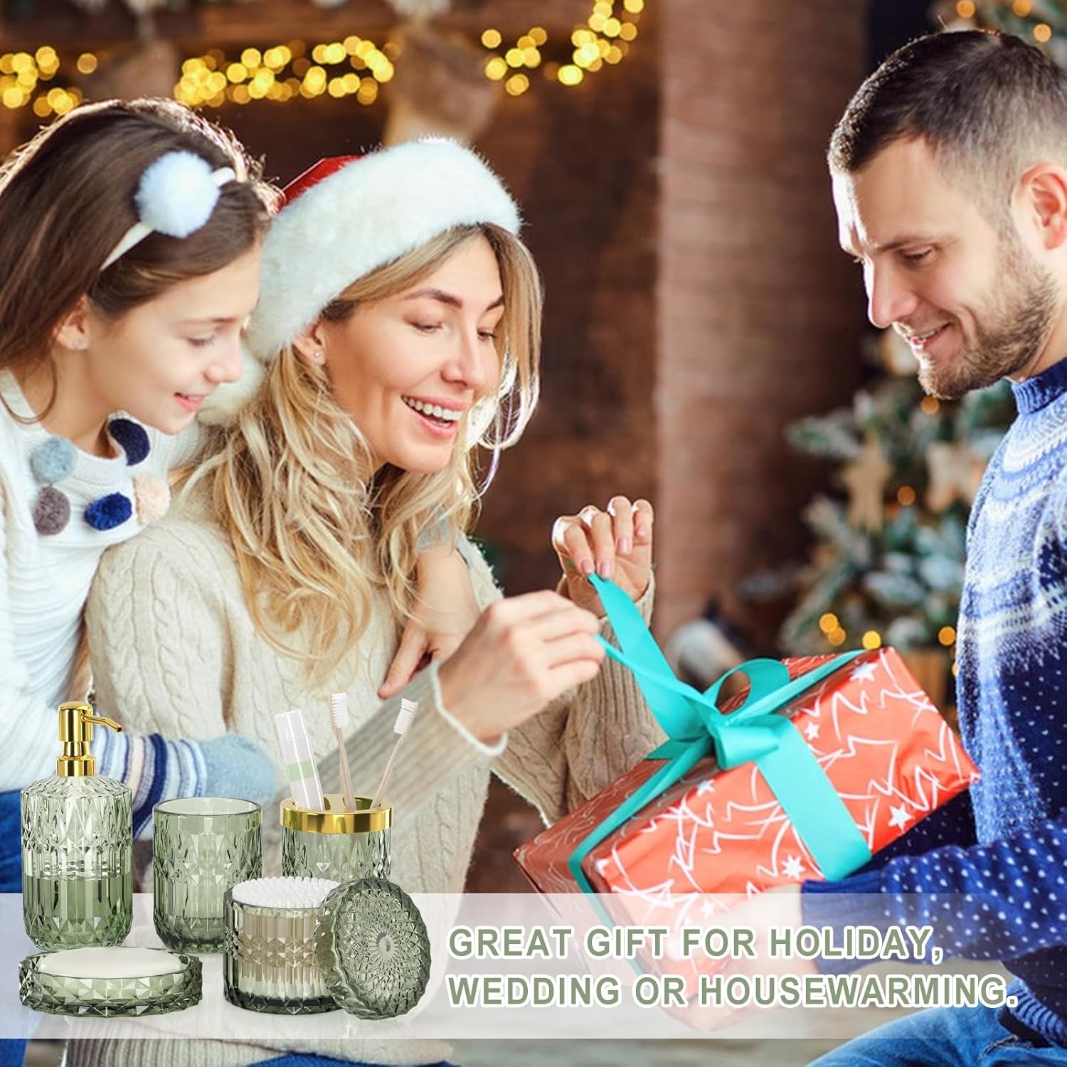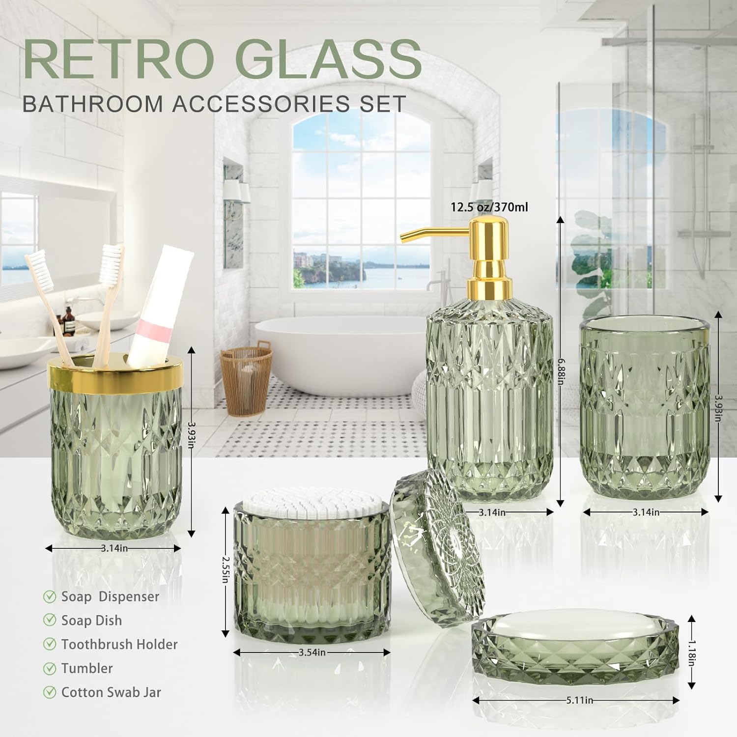 Green Bathroom Accessories Set, 5Pcs Clear Glass Green Accessories with Lotion Soap Dispenser, Soap Dish, Toothbrush Holder, Tumbler, Cotton Swab Jar, Modern Bathroom Decor Crystal Vintage Gift