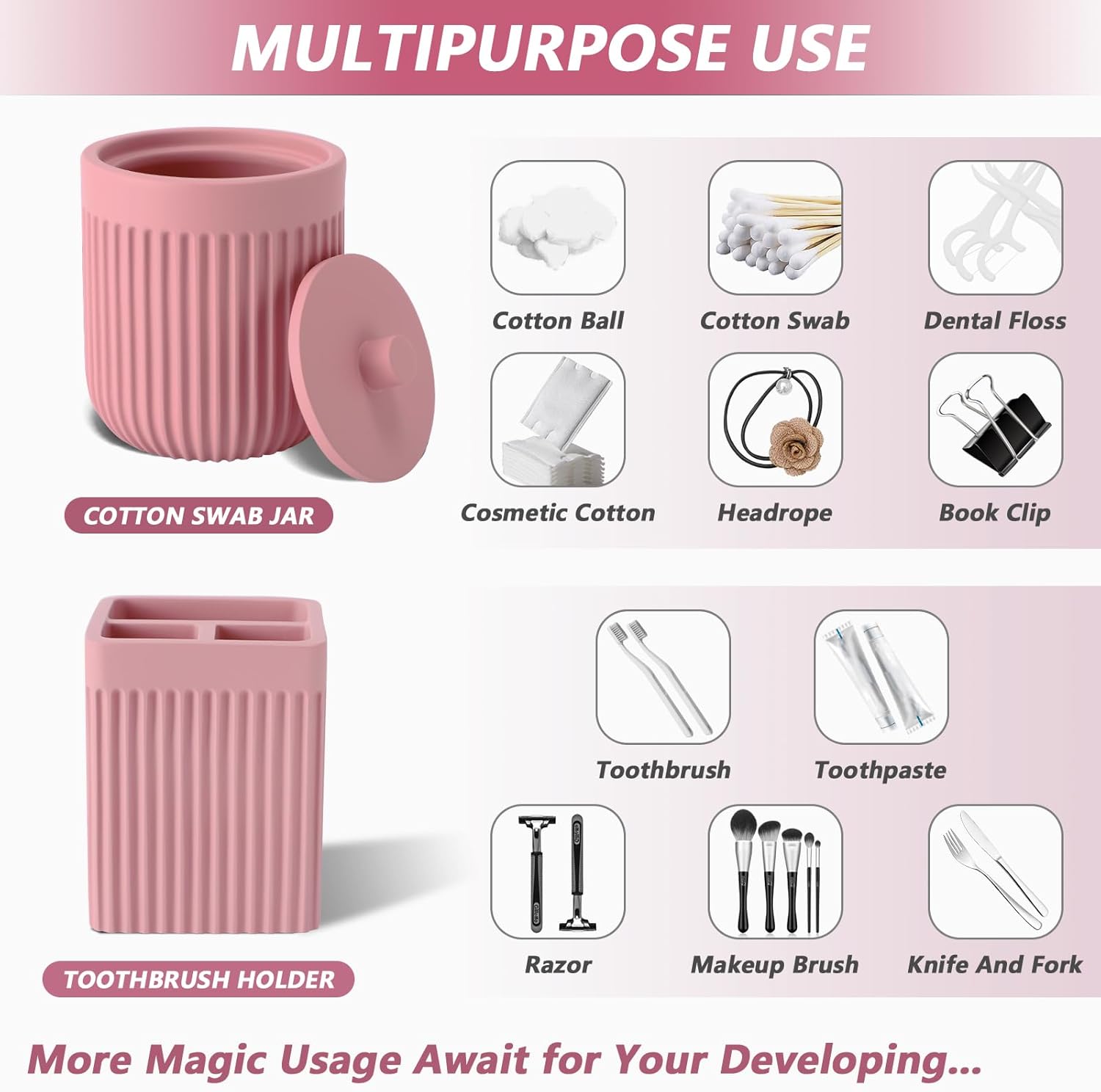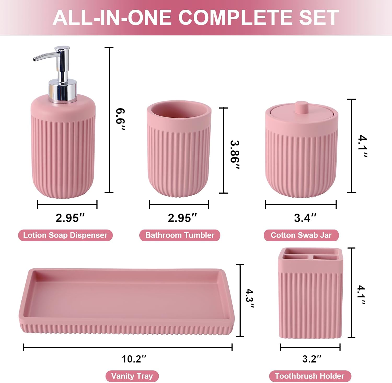Resin Pink Bathroom Accessories Set 5 Pcs, Lotion Soap Dispenser, Toothbrush Holder, Bathroom Tumbler, Qtip Holder and Vanity Tray, Bathroom Countertop Organizer Set for Modern Home Apartment