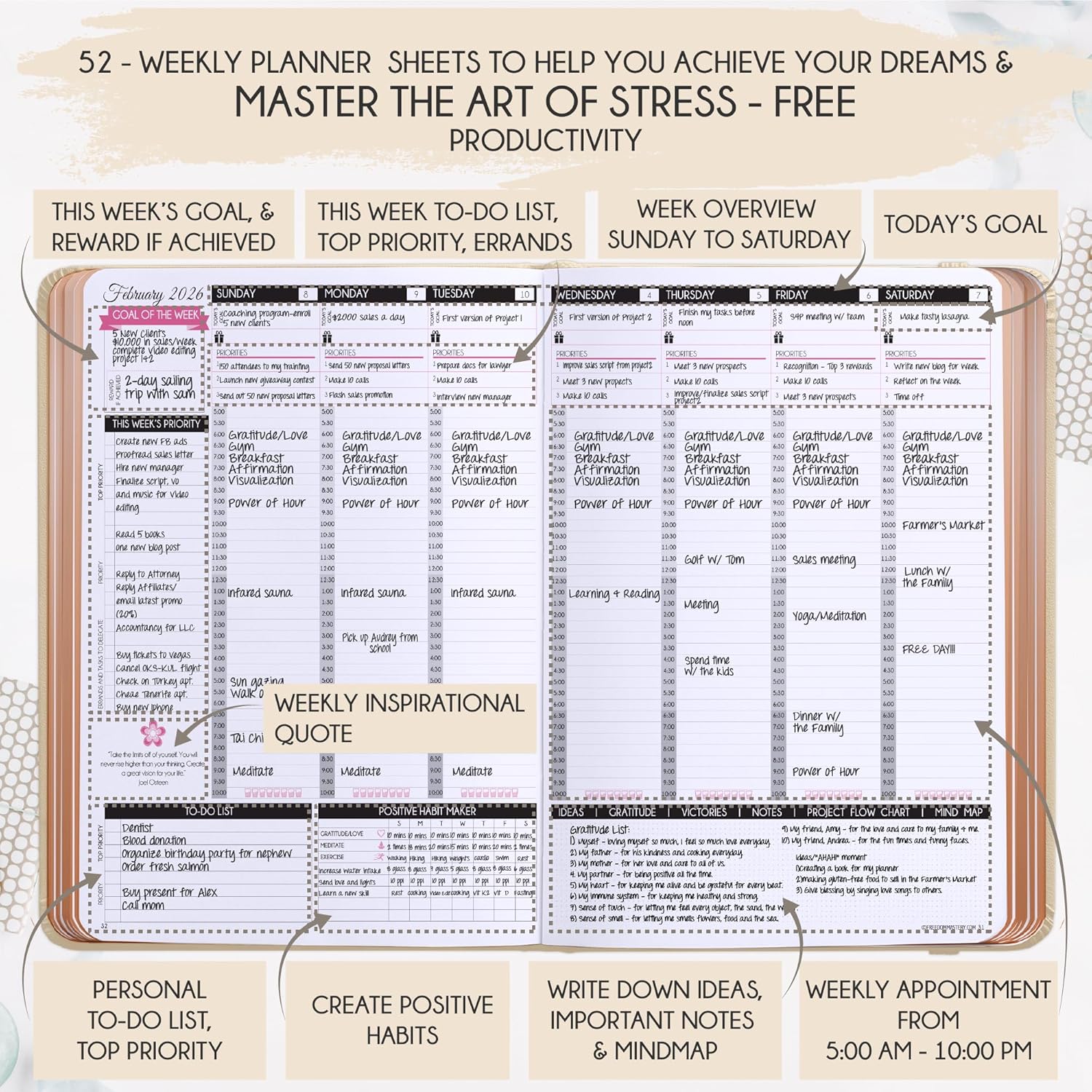 - WEEKLY & DAILY PRODUCTIVITY SYSTEM – Boost focus and happiness with this 2026 weekly planner that also works as a 2026 daily planner, goal planner, gratitude journal, and to-do list organizer. Based on the Law of Attraction framework, this 2026 planner weekly and monthly helps align your goals with actions for success.