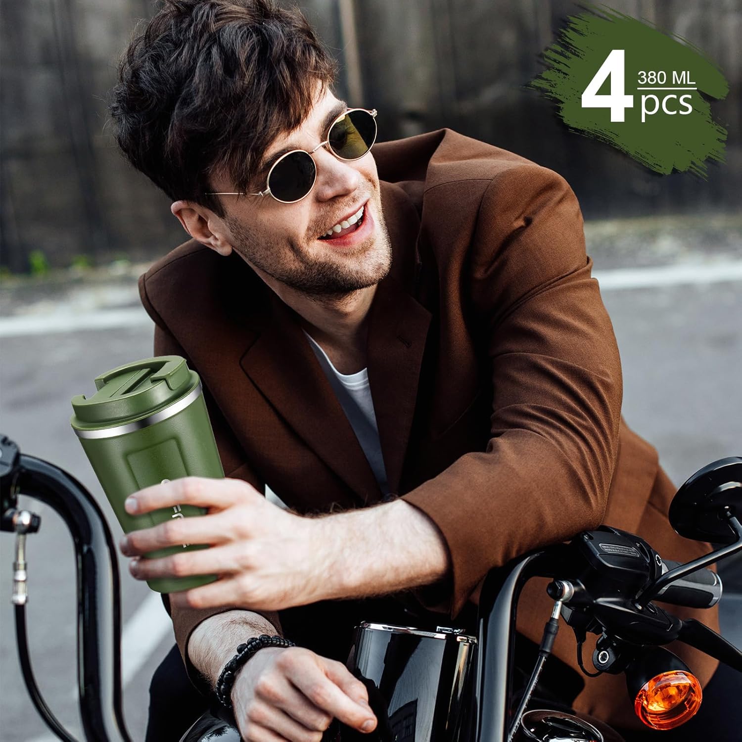 Sieral 4 Pcs 13 oz Travel Coffee Mug Insulated Reusable Coffee Cups with Leakproof Lid Stainless Steel Portable Tumbler for Keep Hot or Ice Milk Tea(Green)