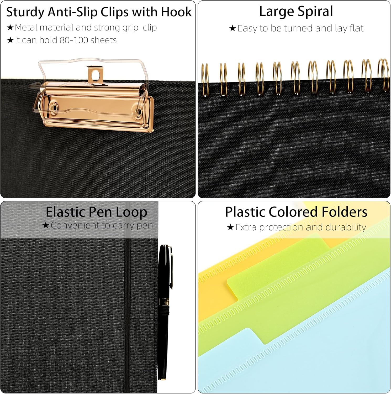 - 【Premium Materials】Unlike other flimsy folders, it features a sturdy metal clip with gripping and double screw coil to provide a secure way and organized way to store. The PP folder, PVC pouch, elastic pen loop and closure keep everything organized and secure, avoiding tears, breaks, and lost accessories. The removable notepad with 25 pages won't bleed ink. Our clipboard folio is designed to address common issues found in low-quality organizers.