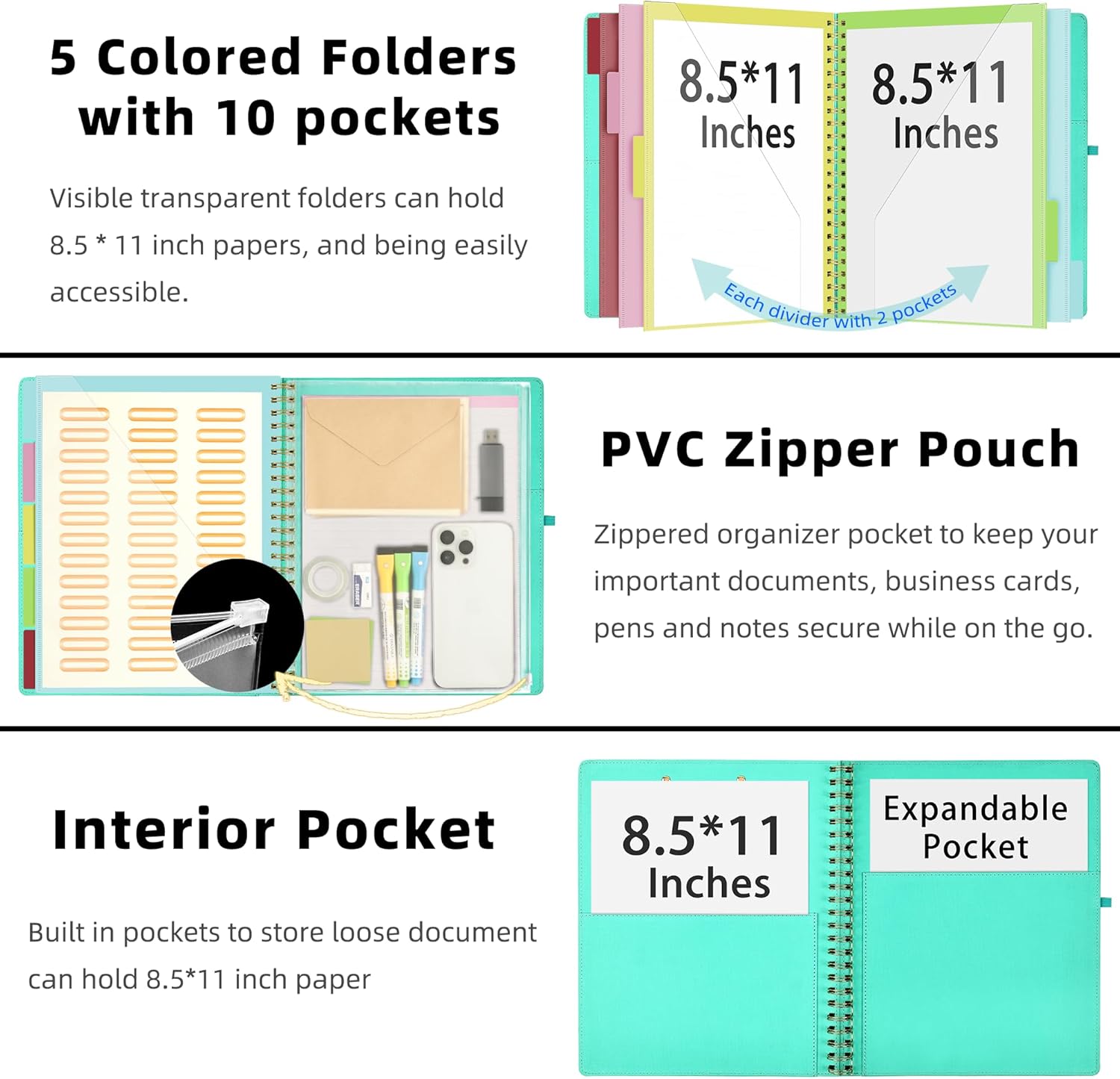 Ospelelf Foldable Spiral Clipboard Folio with Storage Zipper Pouch, 5 Plastic Folders with 10 Pockets,Refillable Lined Notepad (11" x 8.5"), Hardcover Project Organizer with 39 Stickers (Aqua)