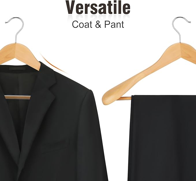 - Stronger & Thicker Non-slip Bar – Each hanger is fitted with a straight bar for hanging pants or whatever garment you deem fit in a non-slip condition. The anti-rust screw strengthens the wood bar to hang heavy clothes