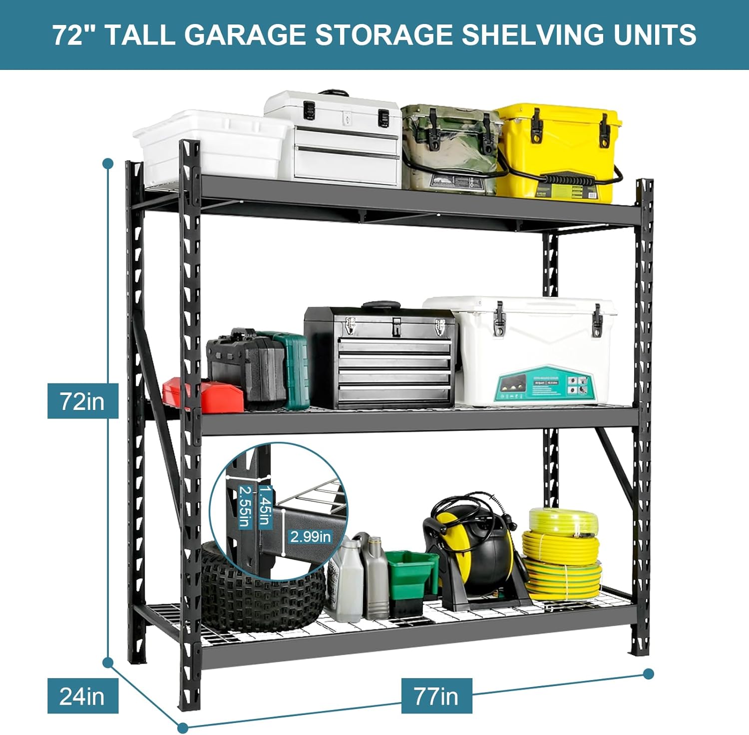 Garage Storage Shelves - Heavy Duty 72”H x 77”W x 24”D Adjustable 3-Tier Metal Shelving Rack, 6000LBS Capacity - Ideal Garage Shelving for Storage Solutions