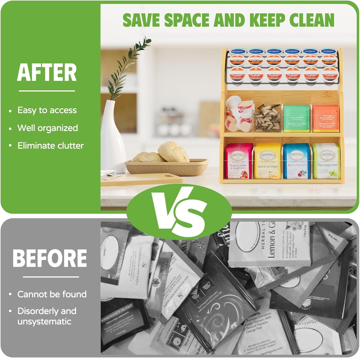 - Organized Item Sorting: Layered compartments with clear categorization provide a systematic way to organize tea bags and coffee pods, ensuring each item has its place, keeping streamlined access to beverages and other items for you.