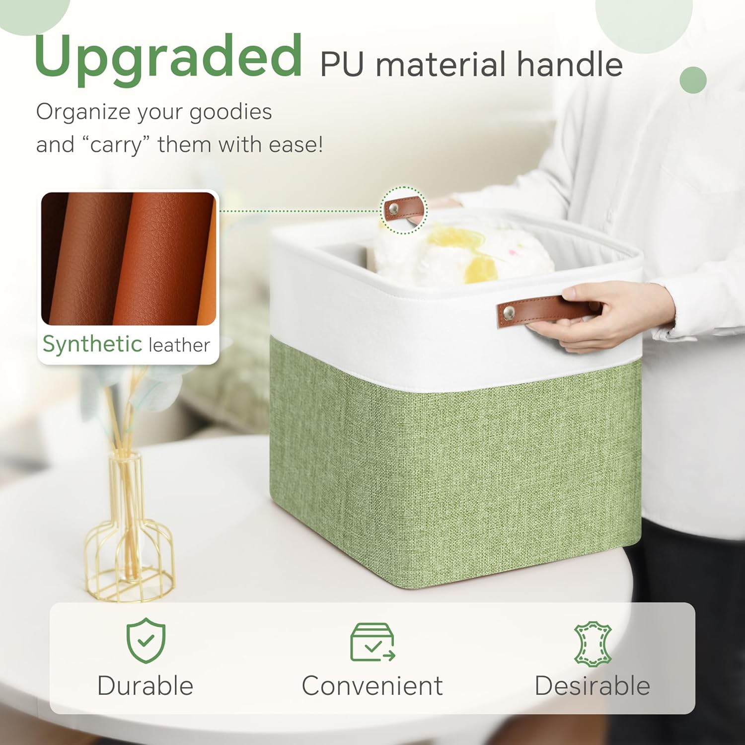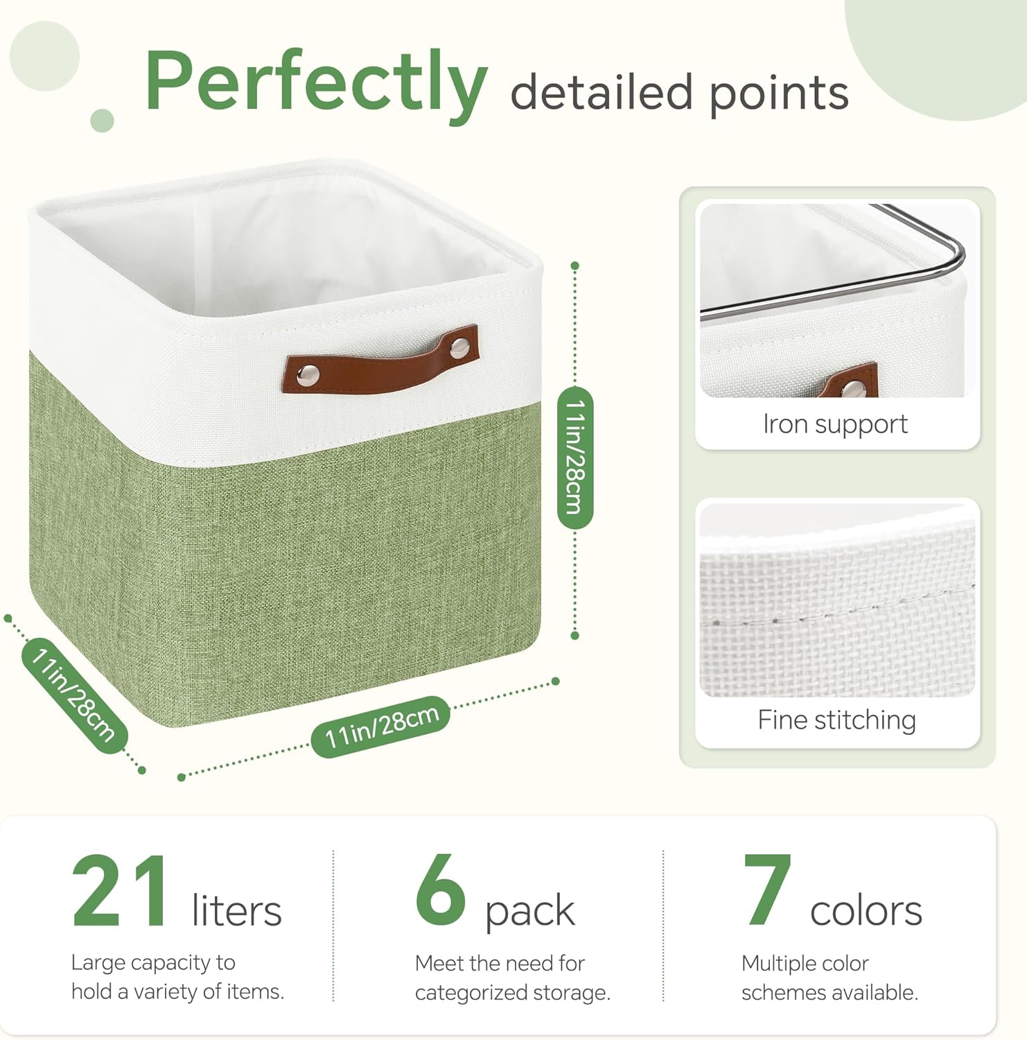 Cube Storage Baskets 6 Pack, 11x11 inch Foldable Cube Storage Bins with Leather Handles for Shelf Closet Nursery Toys (White/ Green)