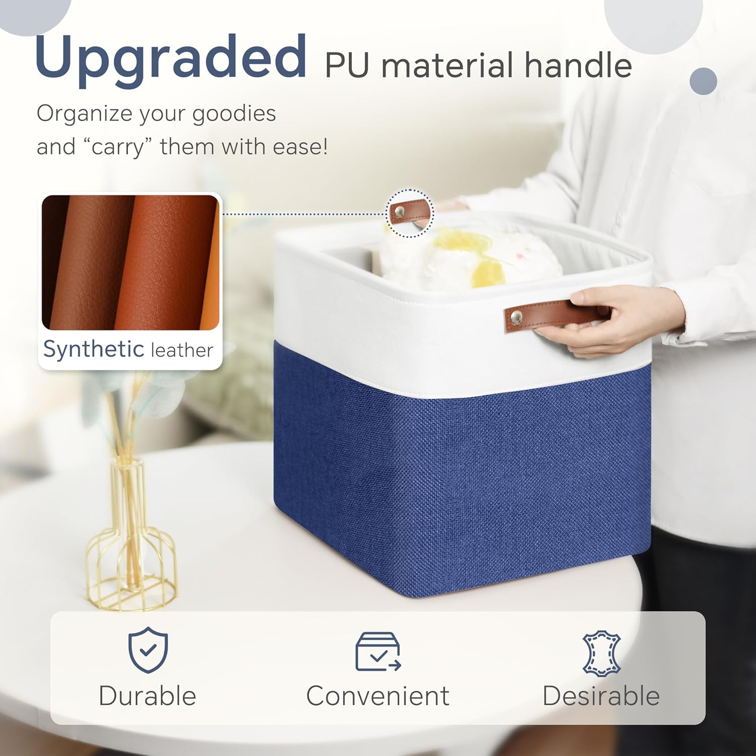 Cube Storage Baskets 6 Pack, 11x11 inch Foldable Cube Storage Bins with Leather Handles for Shelf Closet Nursery Toys (White/ Blue)